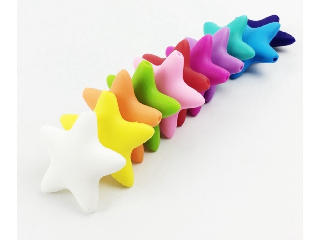 Silikonové hvězdyjsou krásně barevné korále z potravinářského silikonu, které jsou velmi příjemné a zajímavé. Můžete si z nich vyrobit vlastní klip na dudlík, žužlátko, kousátko, silikonový šperk, či náhrdelník. Silikonové korále jsou vhodné k výrobě šperků a dekorací.