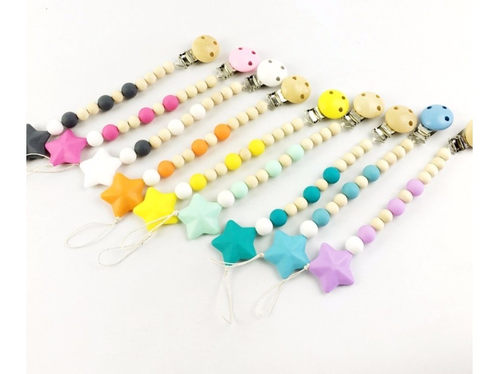 Lze dodělat s klipem na dudlík, silikonovými, obháčkovanámi a dřevěnými korálky, které taktéž naleznete v naší nabídce.