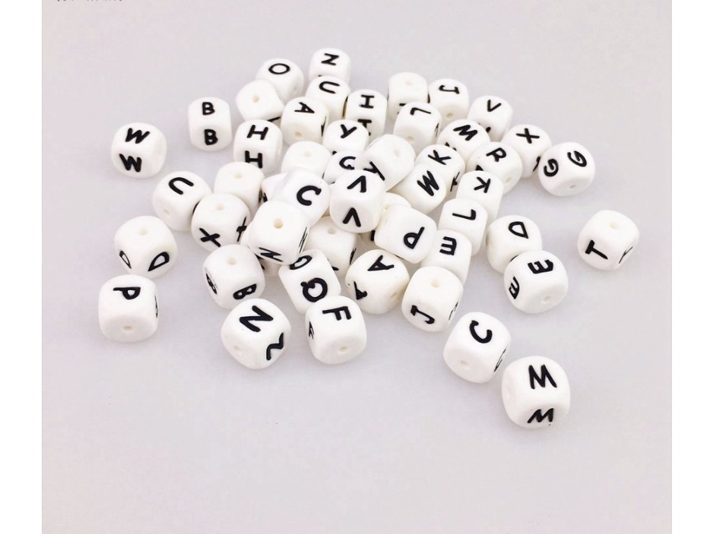 Oblíbené silikonové korálky s motivem písmen; korálky o pr. 12mm.