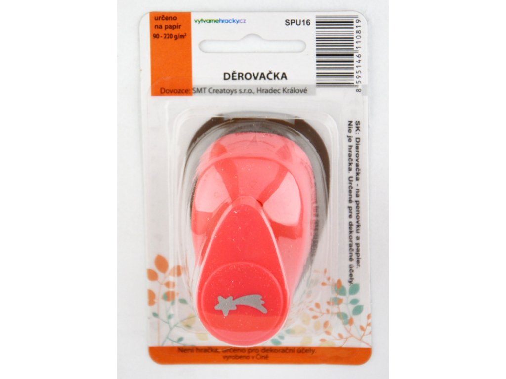 Děrovačka pro výtvarnou tvorbu. Postup: 1. pracujte s děrovačkou na pevné a rovné ploše. 2. vložte papír vhodné tloušťky - 90-220 g/m2 a zatlačte na páku statickým tlakem. Nikdy ne úderem na páku. 3. POUŽÍVEJTE POUZE NA PAPÍR. Děrovačky nikdy nepoužívejte na materiály potažené lepící vrstvou (například na samolepicí štítky), na pěnovku, na papírové ubrousky. Děrovačky nejsou vhodné pro děti do 3let.