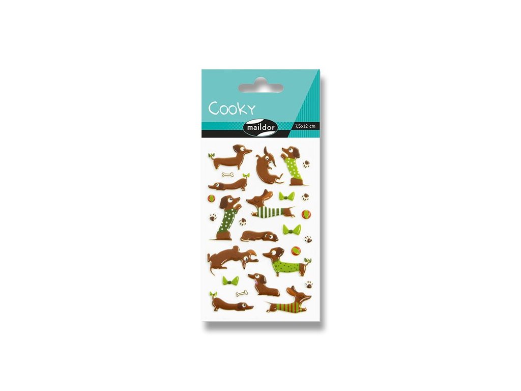 Samolepky Maildor 3D Cooky s motivy rozdováděných jezevčíků a s efektem 3D. Balení obsahuje 1 arch s 26 samolepkami.
