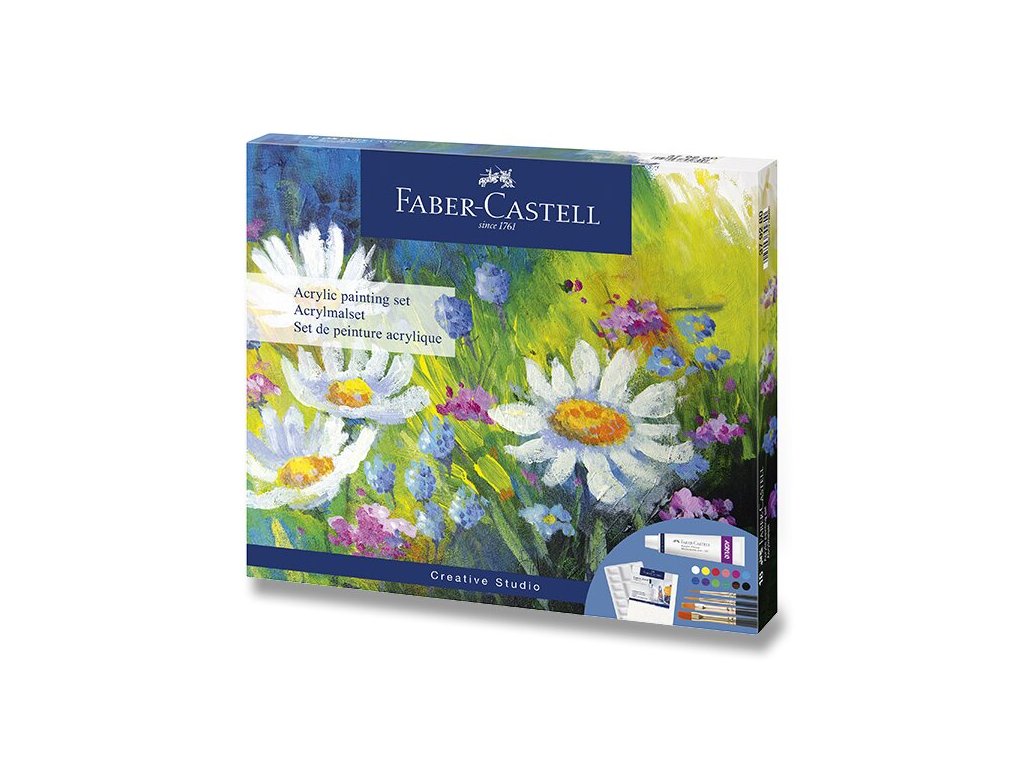 Vysoce pigmentované světlostálé akrylové barvy Faber-Castell mají intenzivní barvy a vzájemně mísitelné odstíny. Po zaschnutí jsou barvy voděodolné. Sada obsahuje 12 x 9 ml akrylových barev, 4 syntetické štětce, 1 plátno 20 x 25 cm a 1 míchací paletu.