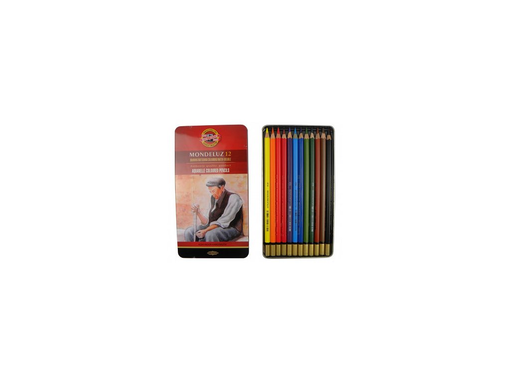 Sada akvarelových pastelek Mondeluz od značky Koh-i-noor v kovové krabičce. Sada obsahuje 12 základních barev, pastelky jsou rozmyvatelné vodou.