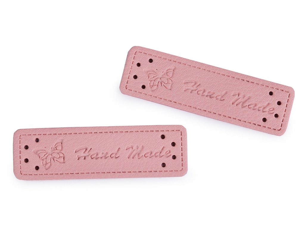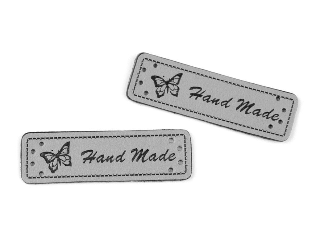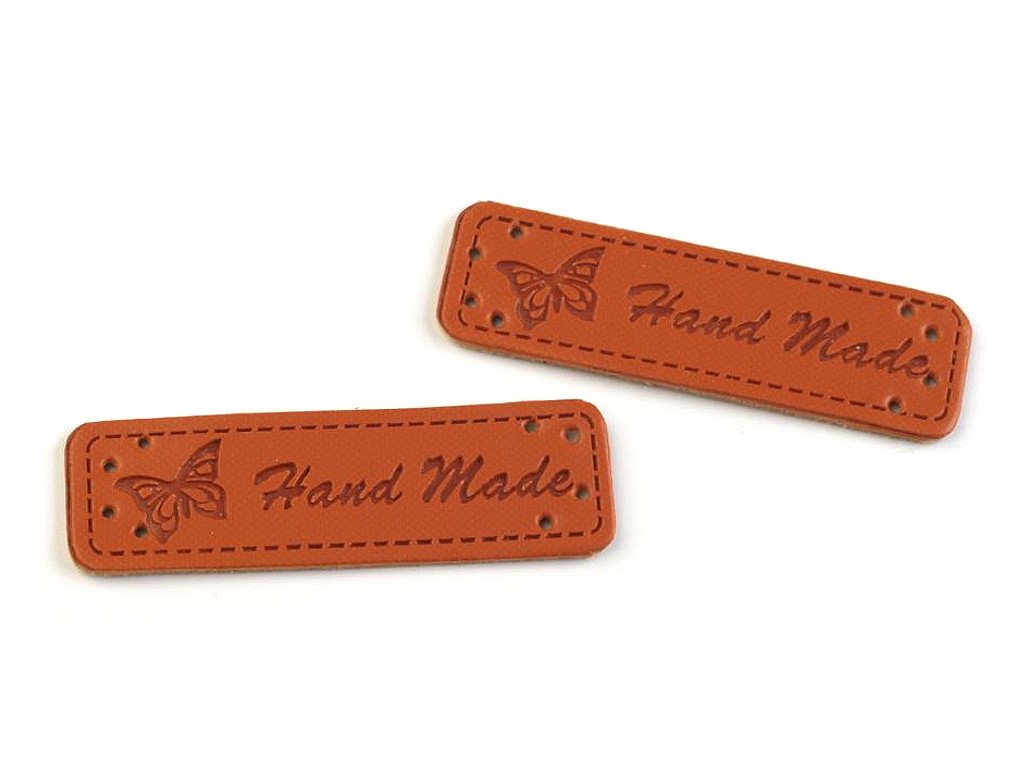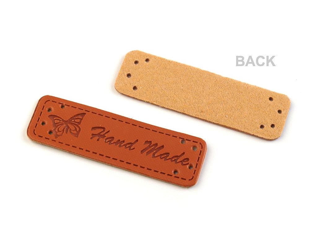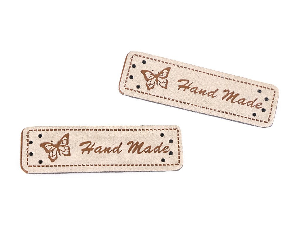 Cedulku z eko kůže oválného tvaru zdobí jednostranný nápis "hand made". Zaujme vás předseknutými otvory, které slouží jako dekorace. Po stranách cedulky jsou dírky, díky kterým ji lze přišít nebo jimi provléct šňůrku.