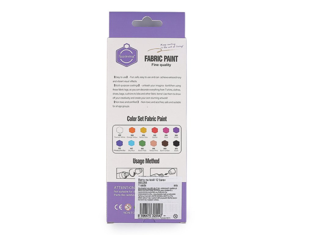 Sada barev na textil je vyrobená z nejnovějších materiálů na malování na mezinárodním trhu. Barvy jsou bezolovnaté a netoxické. Vyhovují normám ASTM D4236 a EN71-3. Pro dobré zdraví vás i vašich dětí je použití těchto barev na textil tou nejlepší volbou. V balení najdete 12 barevných odstínů v uzavíracích tubách o obsahu 6 ml.