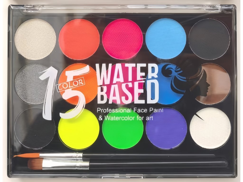 Barvy na obličej, 15 barev, 2 štětce - neonové barvy
