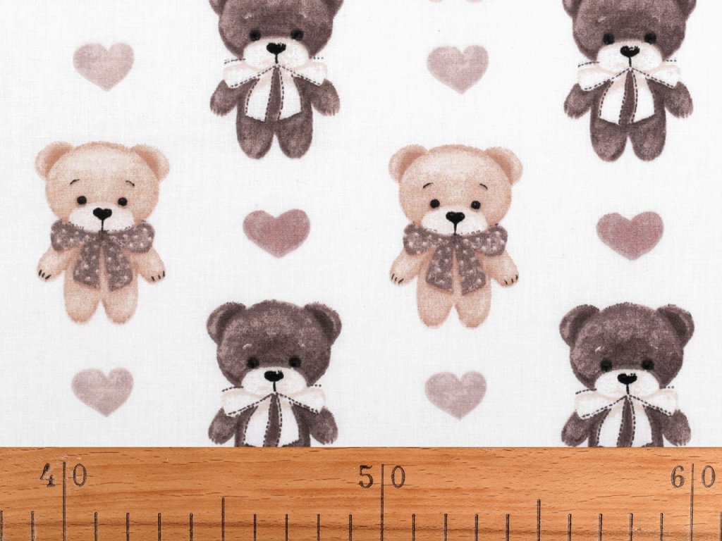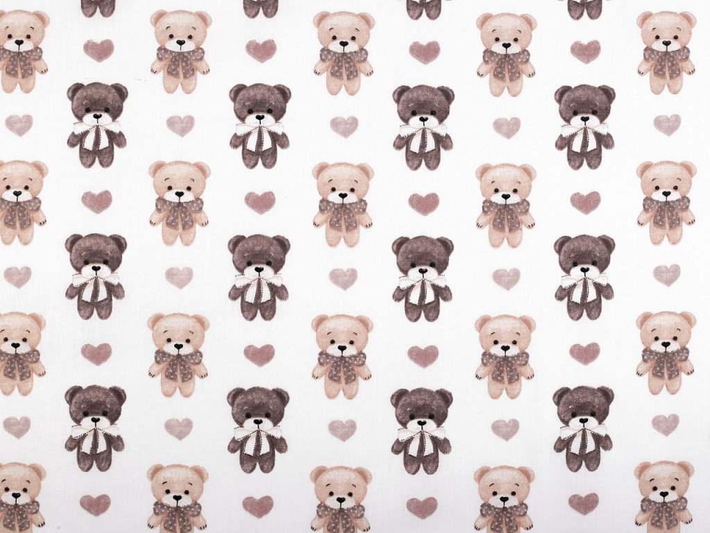 Bavlněnou látku zdobí motiv roztomilých medvídků. Využijete ji na šití polštářů, dětského povlečení, závěsů, pytlíků, tašek nebo kapsářů.