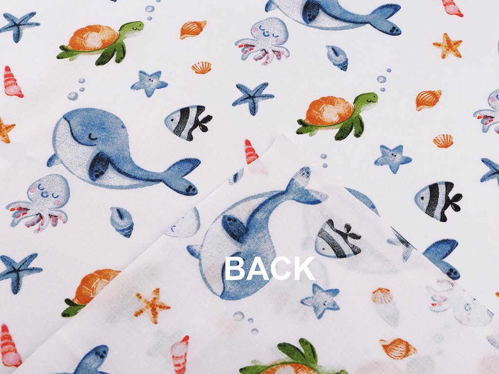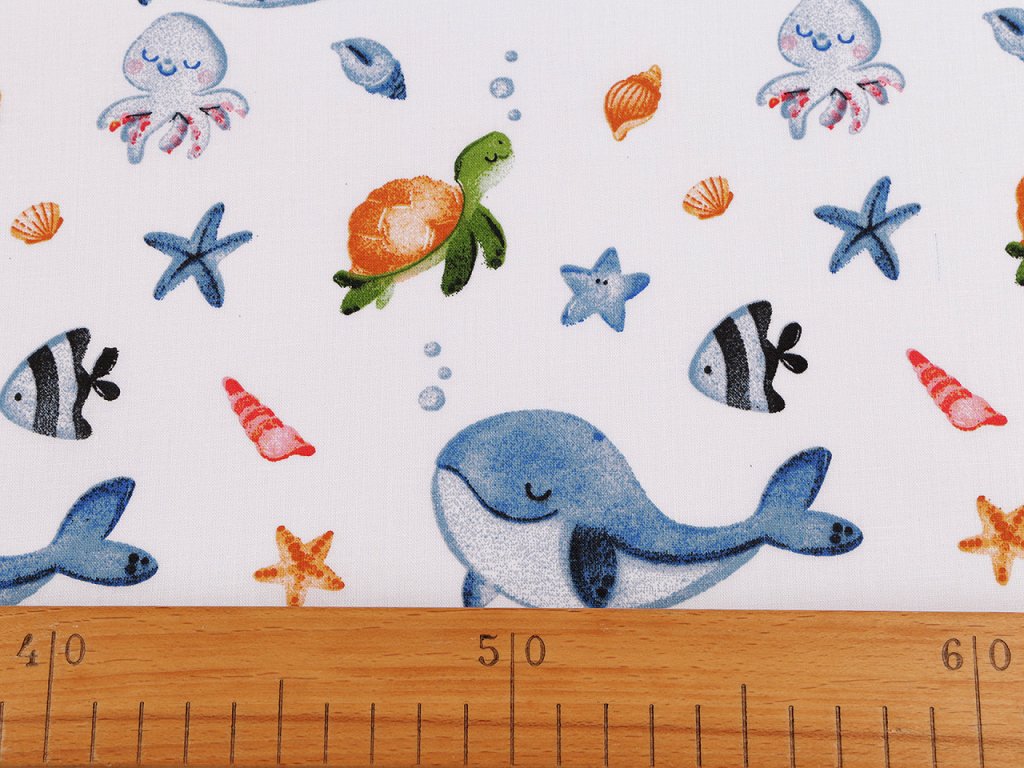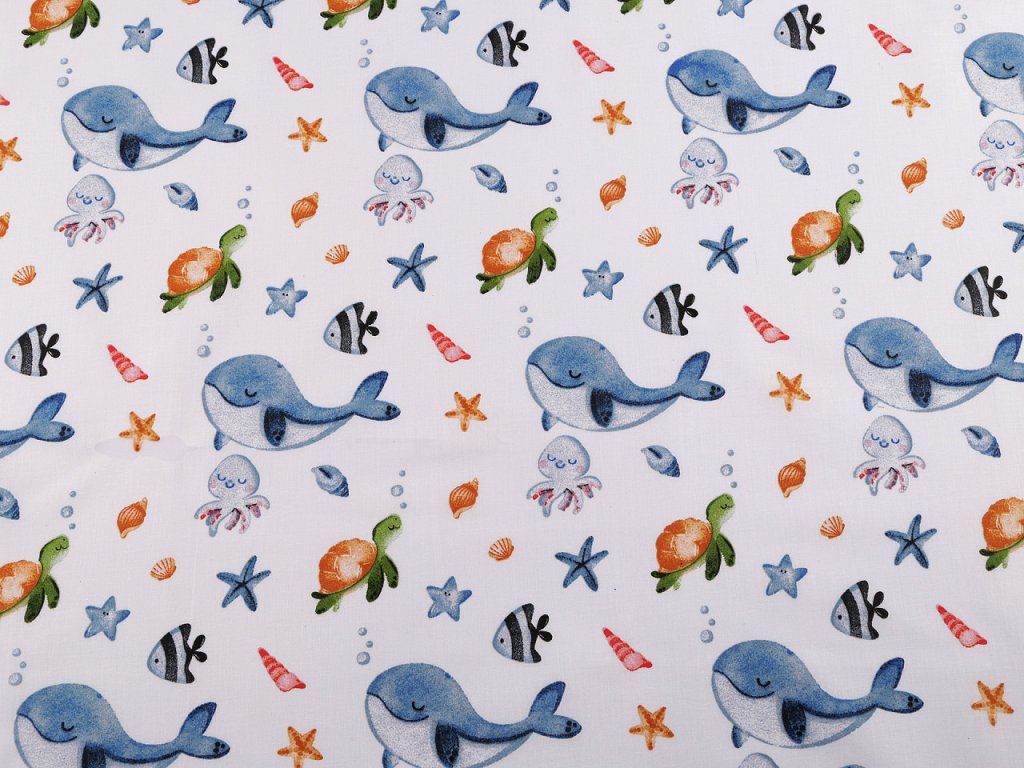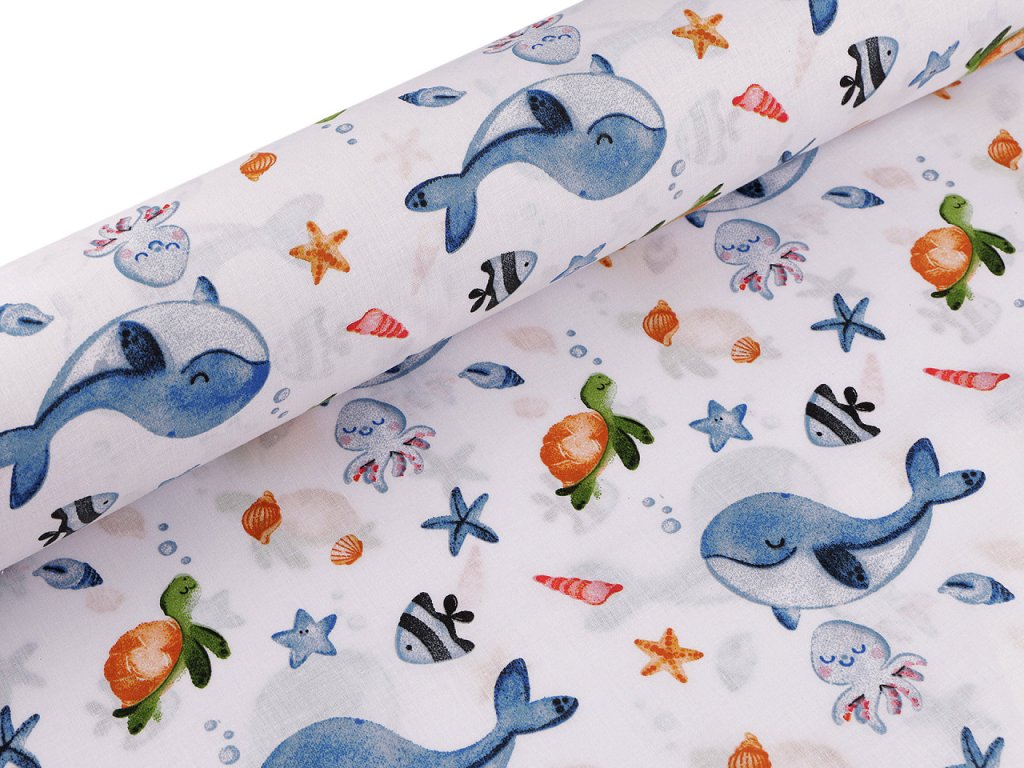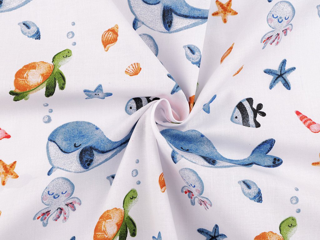 Bavlněná látka pro malé i větší milovníky podmořského světa. Je vhodná na šití polštářů, dětského povlečení, závěsů, pytlíků, tašek nebo kapsářů.