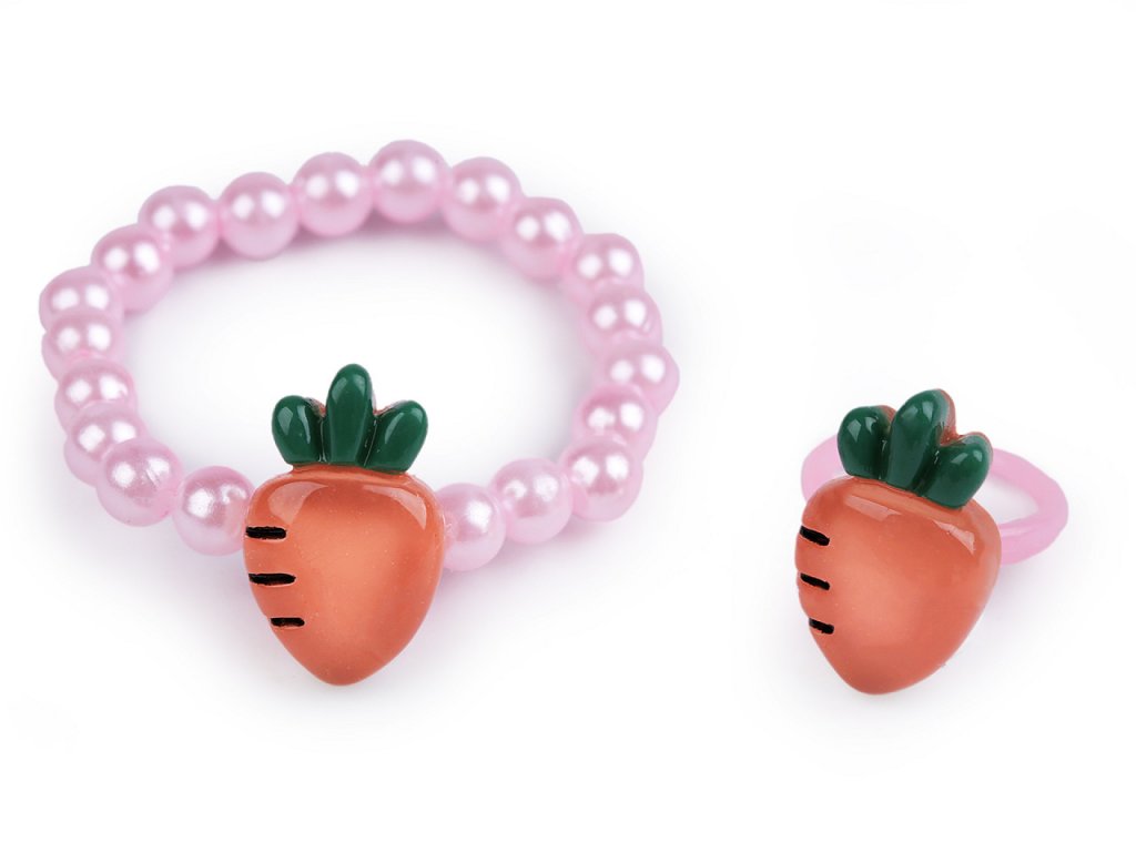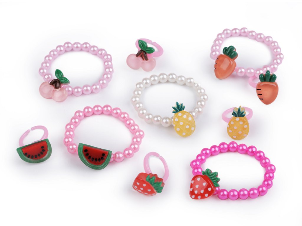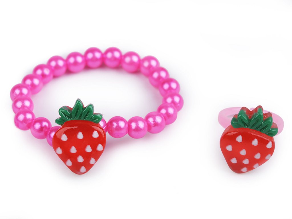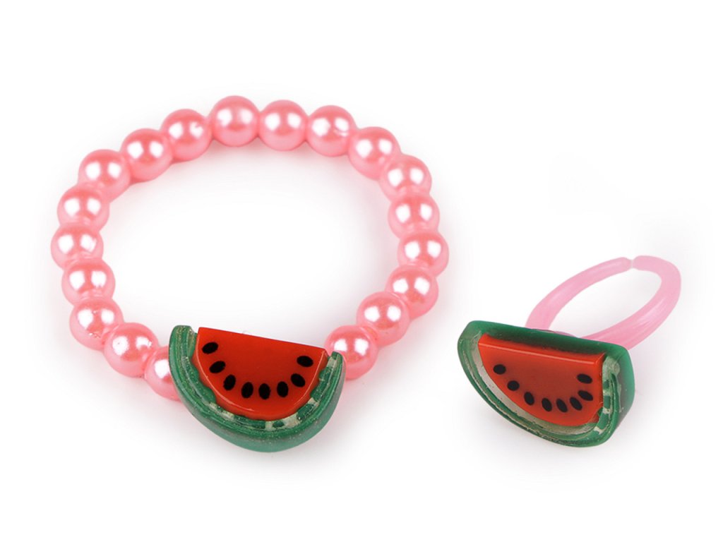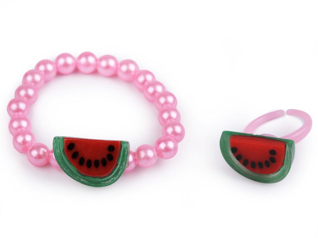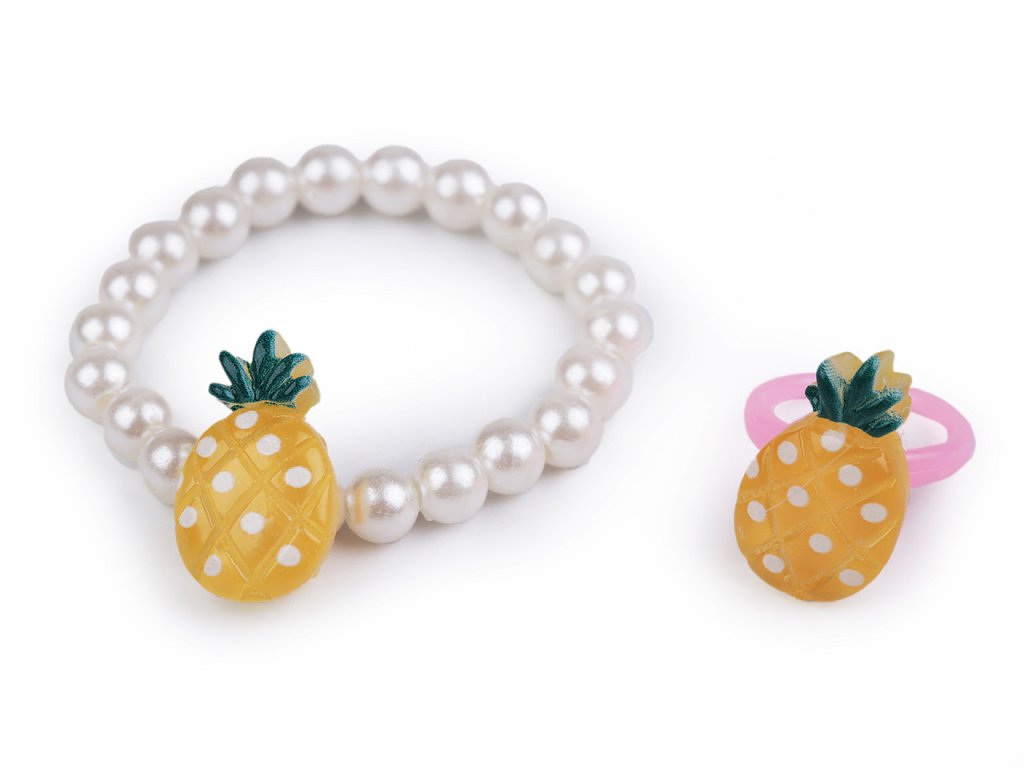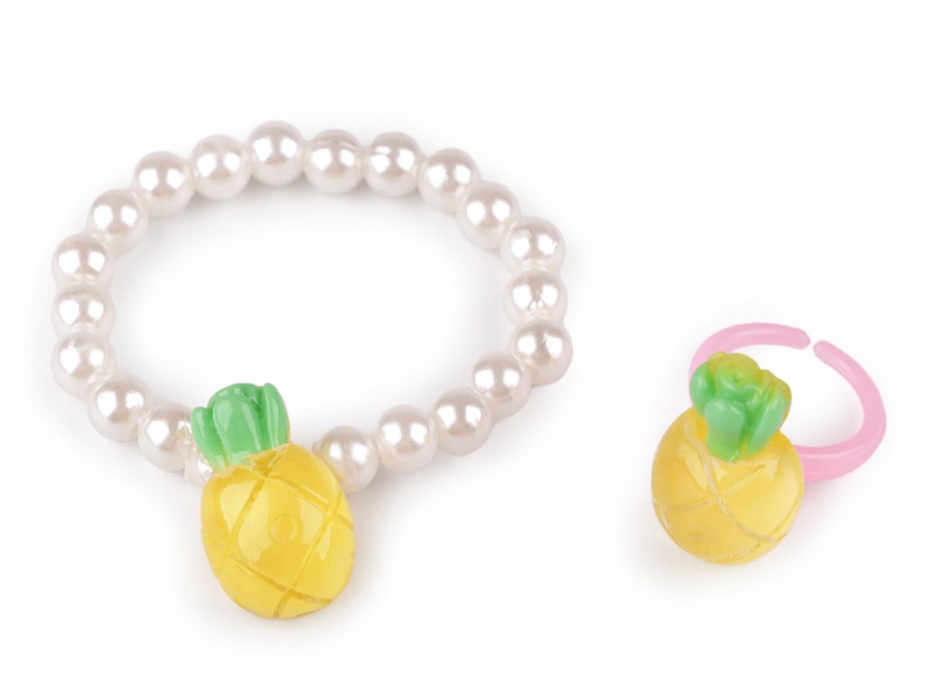 Perlové korálky na náramku jsou navlečené na pružné gumičce. Střed náramku je ozdobený motivem ovoce, který se opakuje i na prstýnku. Náramek nemá uzávěr, je pružný, jde pohodlně navléci.