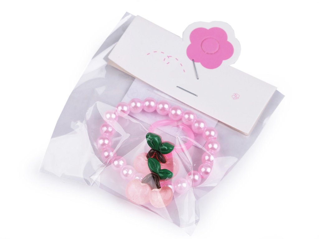 Dětská sada roztomilých šperků z plastových korálků s perlovým leskem obsahuje náramek a prstýnek.