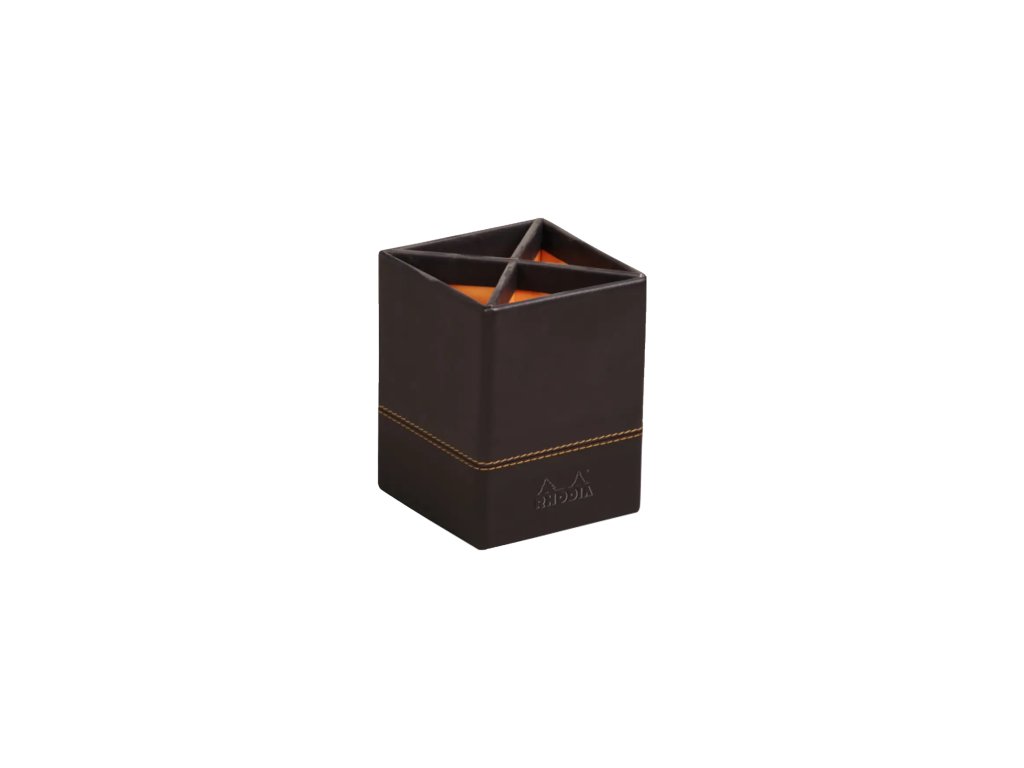 Praktický a elegantní stojánek na psací potřeby vyrobený z italské imitace kůže s ozdobnými oranžovými stehy. Vyražené logo Rhodia.