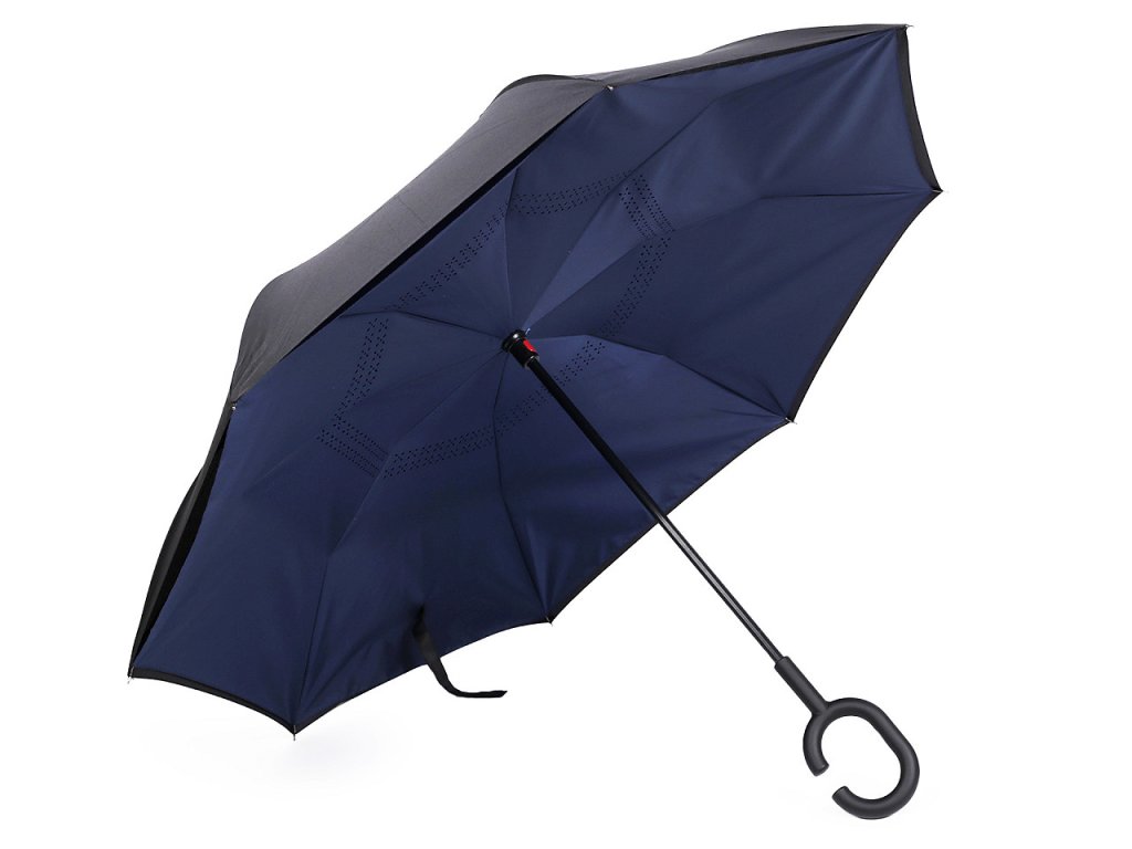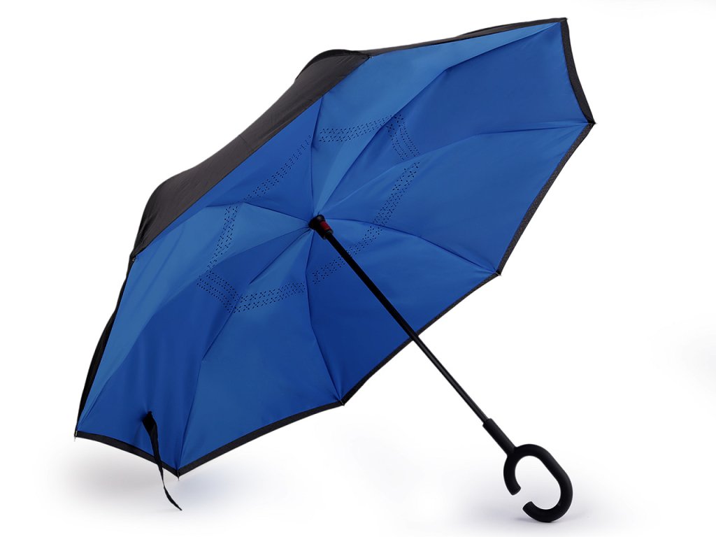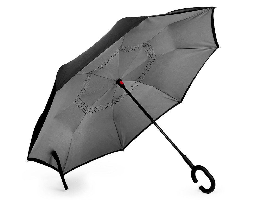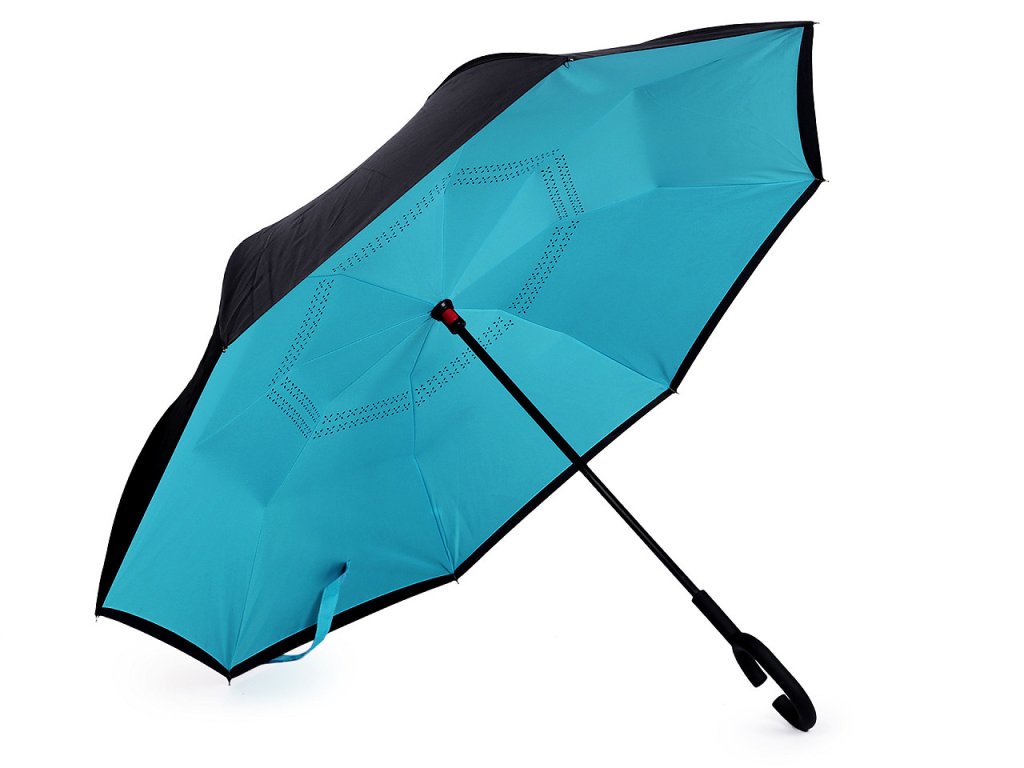 Obrácený deštník s okrasně perforovaným vnitřním potahem má revoluční řešení konstrukce. Díky opačnému otevírání a zavírání deštníku směrem vzhůru voda zůstane schovaná uvnitř v deštníku. Je to veliká výhoda např. když usedáte do automobilu, voda na vás již při zavírání nesteče, ale zůstane v deštníku. Jistě oceníte i jeho praktické sušení. Deštník sám stojí, stačí jej postavit na vhodné místo a voda sama steče ven, deštník už nemusíte rozevírat. Rukojeť ve tvaru C umožňuje deštník zaháknout přímo na paži, vaše ruce zůstanou volné např. k telefonování.
