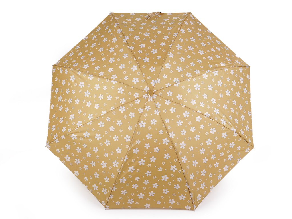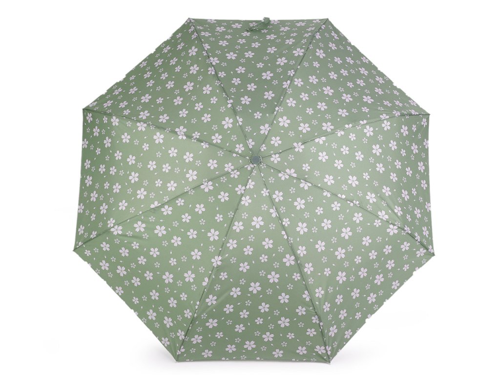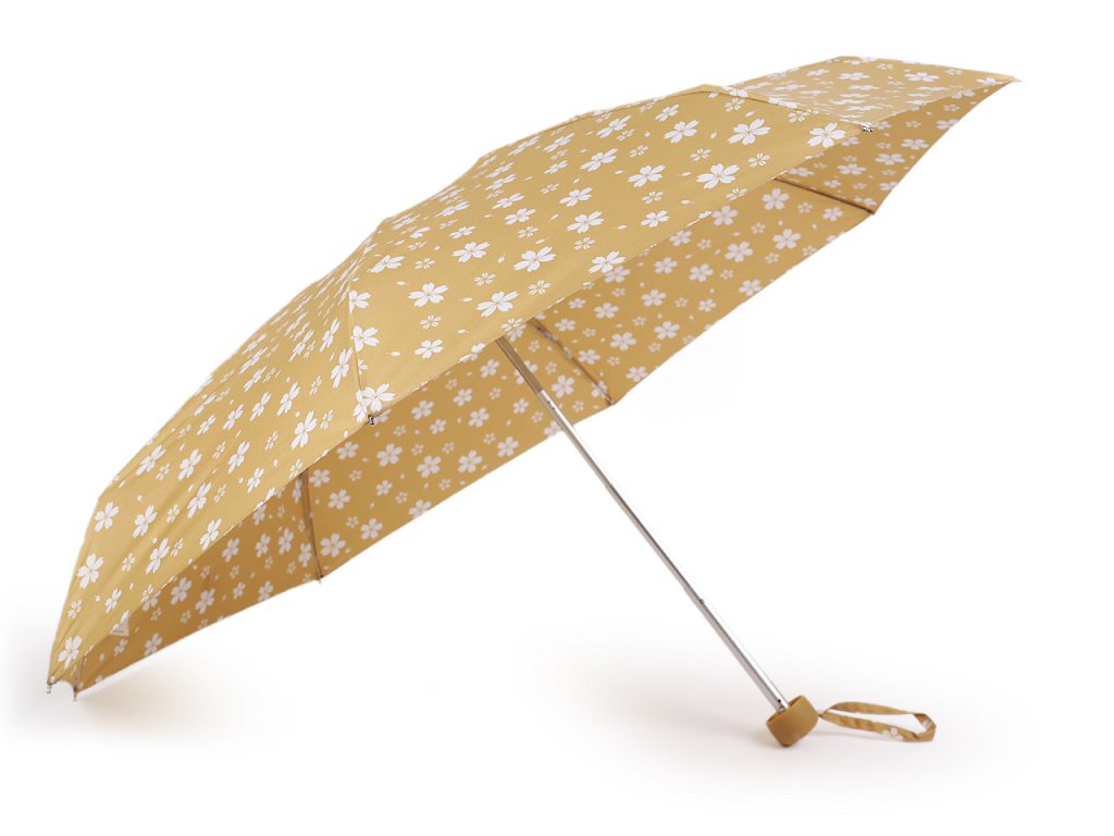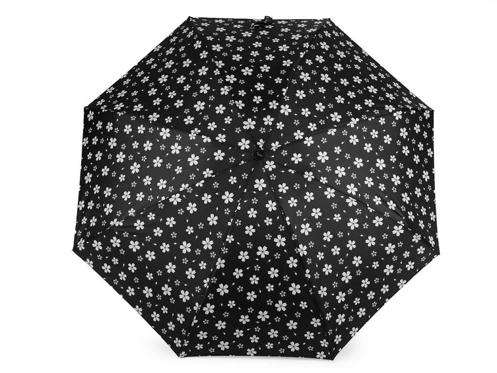 Dámský skládací deštník [s květy]. Díky hliníkové konstrukci a malé velikosti je lehký a skladný, pohodlně se vám vejde do kabelky. Obstojí i v silném větru, kovová konstrukce kombinovaná s pružnými lamelami zajišťuje vysokou pevnost a stabilitu. Deštník je složený z osmi polí. UV filtr vás ochrání před slunečním zářením. Rukojeť deštníku je plastová, opatřená poutkem. Součástí deštníku je ochranný obal.