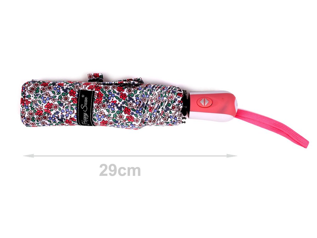 Plně automatický skládací deštník je vyrobený z kvalitního materiálu. Na potahu deštníku je motiv s drobnými květy. Deštník má vystřelovací/sestřelovací mechanizmus. Rozevře i zavře se stisknutím tlačítka se šipkou nahoru nebo dolů. Rukojeť deštníku je plastová, opatřená poutkem. Konstrukce deštníku se skládá z osmi polí. Součástí deštníku je ochranný obal.