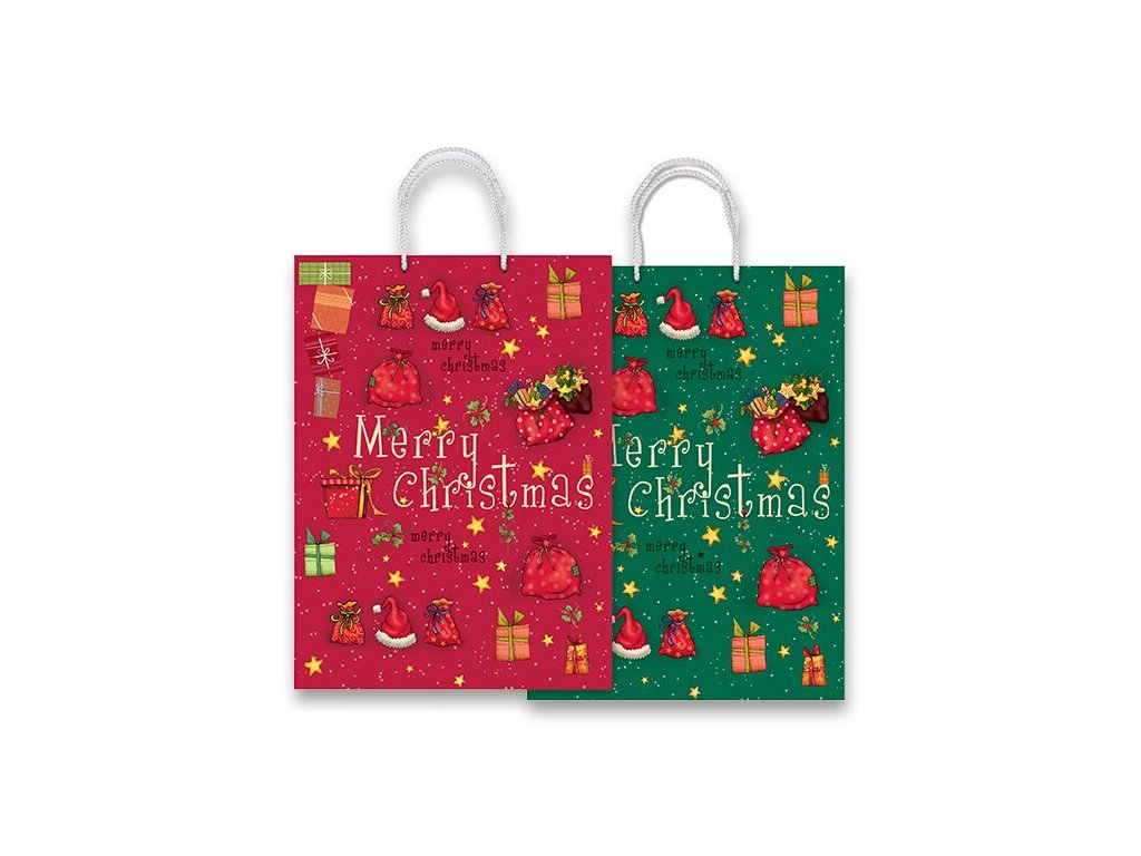 Dárková papírová taška v atraktivním vánočním motivu. Z jedné strany červený potisk, z druhé zelený potisk.