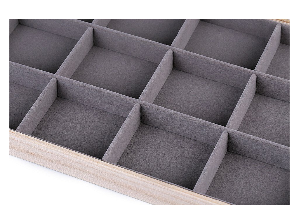 Dřevěné sametové plato vám pomůže vkusně vystavit drobné zboží v prodejnách. Je vhodné na prezentaci přívěsků, prstenů, korálků, kamenů apod. [Najde využití i jako organizér v domácnosti, do skříně, šuplíku apod.] V platu je 12 přihrádek, jsou potažené jemným sametem. Všechny přepážky jsou odnímatelné.