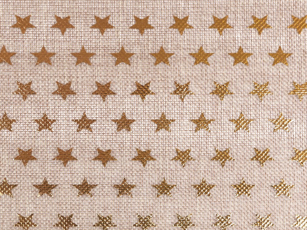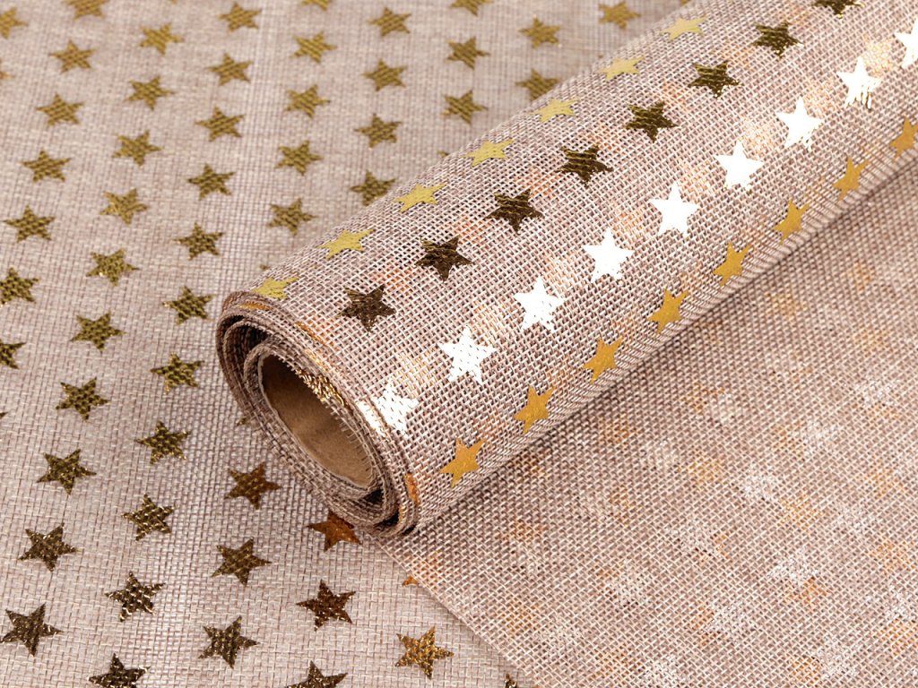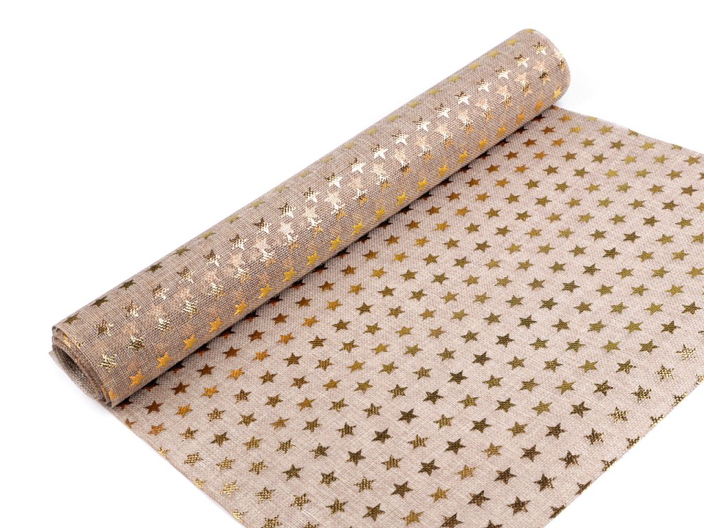 Dekorační metráž s potiskem hvězd svým zpracováním imituje jutu. Využijete ji jako běhoun na stůl nebo k ozdobě květináčů, truhlíků apod.