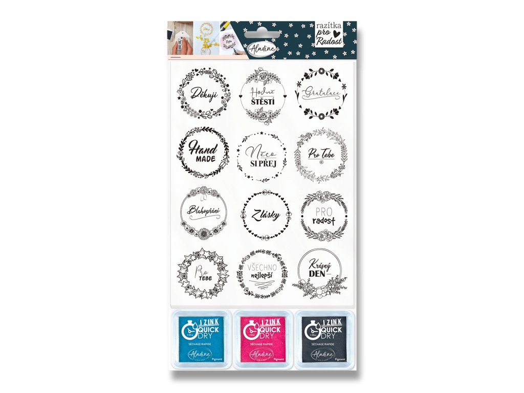 Gumová razítka Aladine Stamp with Love s motive Příležitosti na pěnové hmotě. Razítka mají hluboký reliéf a precizně propracované detaily. Sada obsahuje razítka a razítkovací polštářky určené pro potisk papíru, kartonu i dřeva. Razítka jsou určená k výrobě originálních nápaditých visaček, označování a výrobě drobných dárků. Díky hluboké textuře je možné kromě tradičního potisku papíru také razítka obtiskovat do keramických, polymerových a jiných hmot. Motivy vynikají i na dřevě nebo textilu.