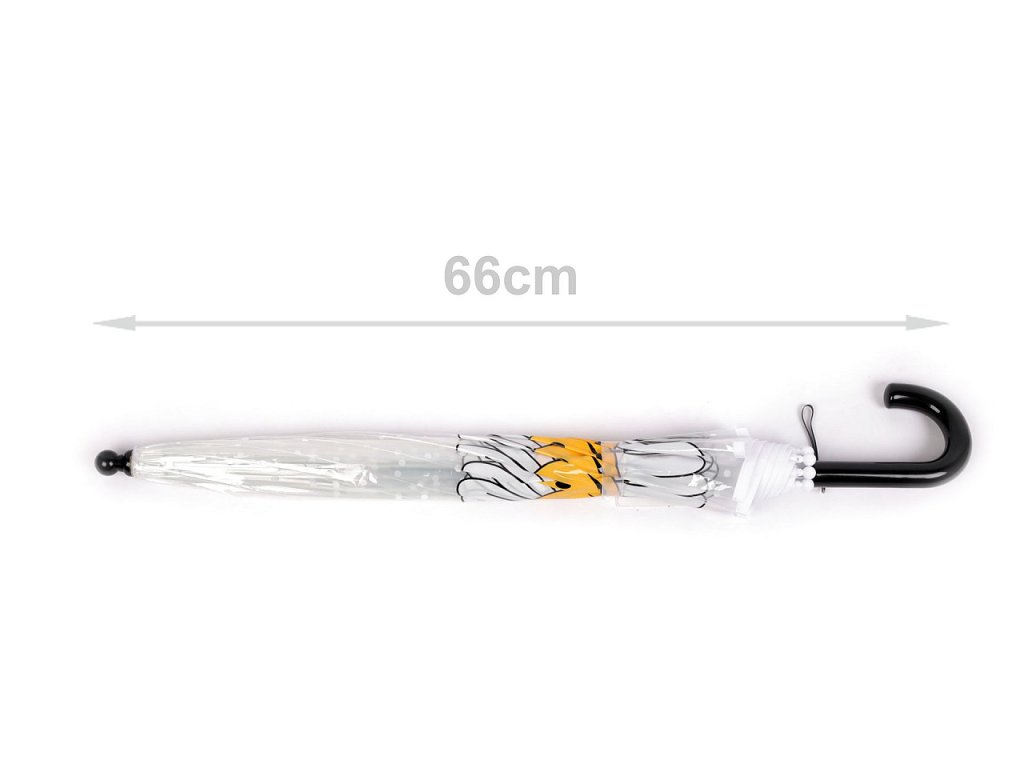 Hluboký průhledný deštník s potiskem květů kopretin a puntíků je děvčaty mimořádně oblíbený. Je dostatečně hluboký, dívky budou mít pocit, že jsou celé schované. Deštník má manuální otevírání, má klasickou tyč zakončenou pevnou rukojetí. Konstrukce deštníku je z pružných lamel a tvoří osm polí.