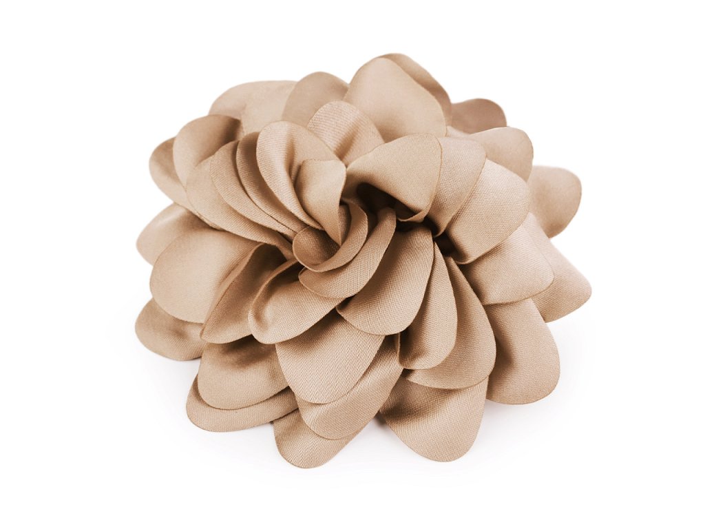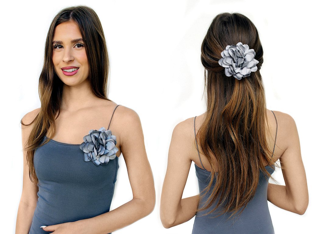 Saténový květ můžete nosit jako brož i jako ozdobu vlaasů. Má bohatý 3D tvar a typický saténový lesk. Ve spodní části má spínací špendlík a klips, takže ji můžete připevnit jak na oděv, tak do účesu. Květ využijete jako ozdobu na šaty, halenku, sako nebo kabelku. Ve vlasech bude působit romanticky.
