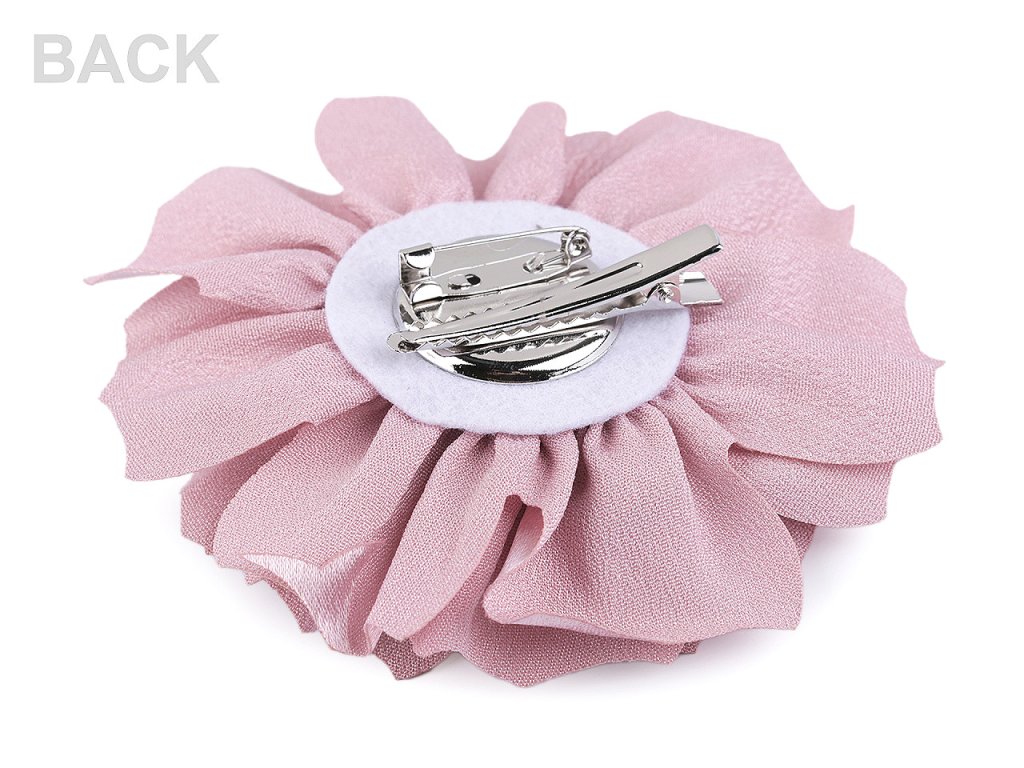 Brož saténového květu má bohatý 3D tvar. Ve spodní části má spínací špendlík a klips, takže ji můžete připevnit jak na oděv, tak do vlasů. Květ využijete jako ozdobu na šaty, halenku, sako nebo kabelku. Ve vlasech bude působit romanticky.
