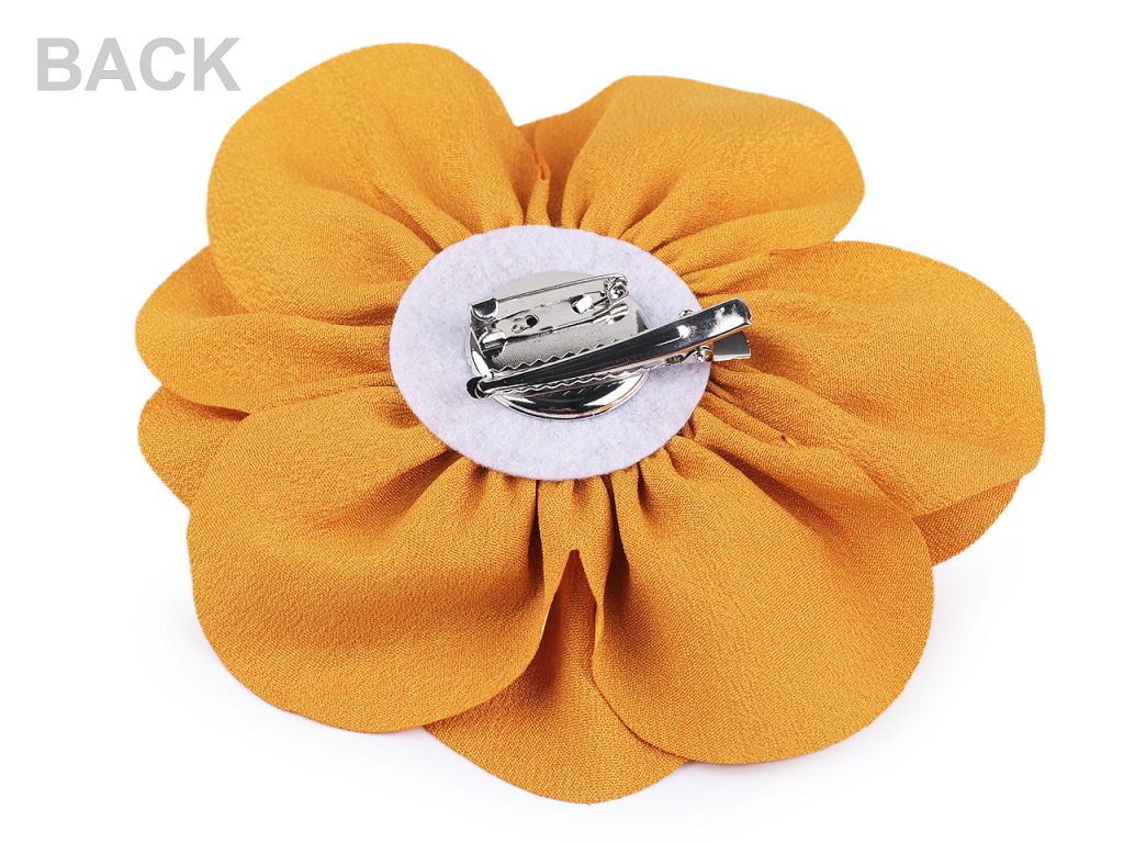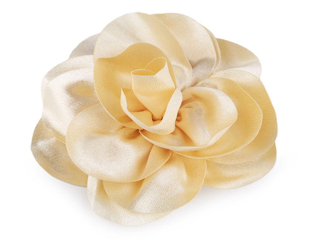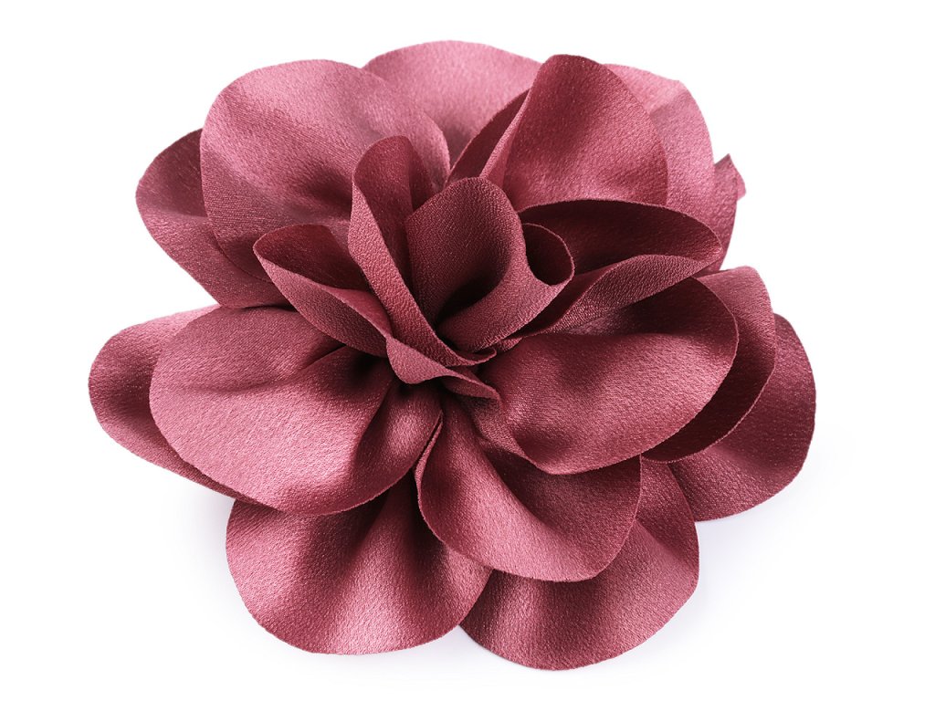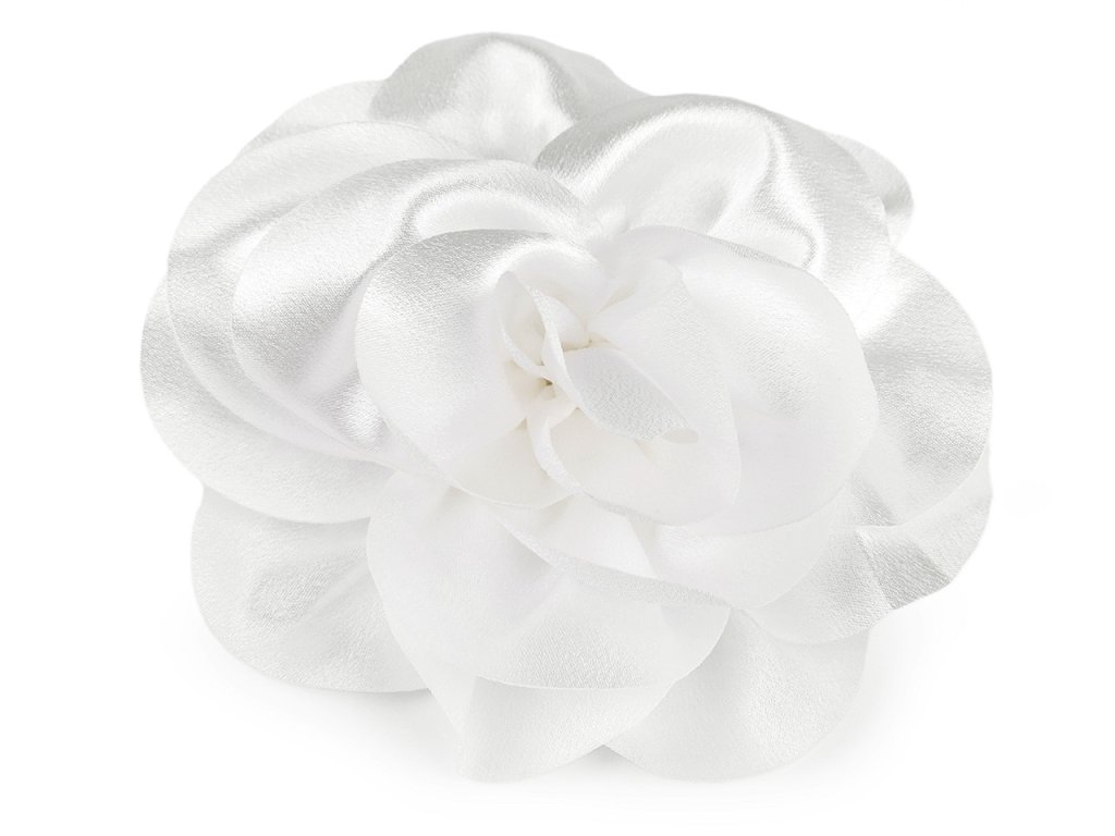 Saténová brož velkého květu má bohatý 3D tvar. Ve spodní části má spínací špendlík a klips, takže ji můžete připevnit jak na oděv, tak do vlasů. Květ využijete jako ozdobu na šaty, halenku, sako nebo kabelku. Ve vlasech bude působit romanticky.