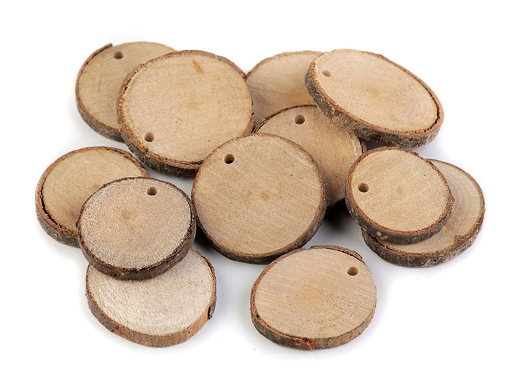 Přírodní dřevěný přívěsek se hodí k dalšímu dotvoření. Je rovný, nahoře má otvor k zavěšení. Není barvený ani lakovaný, každý kus se může lišit jak barvou, tak kresbou dřeva. V balení mohou být přívěsky s kůrou i bez kůry.