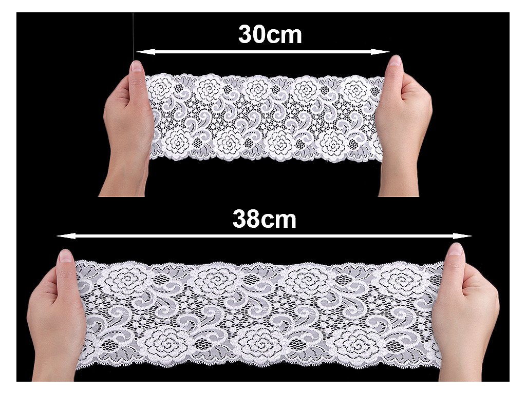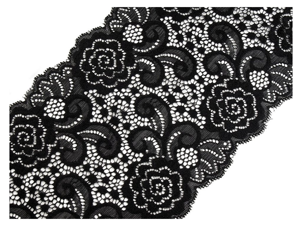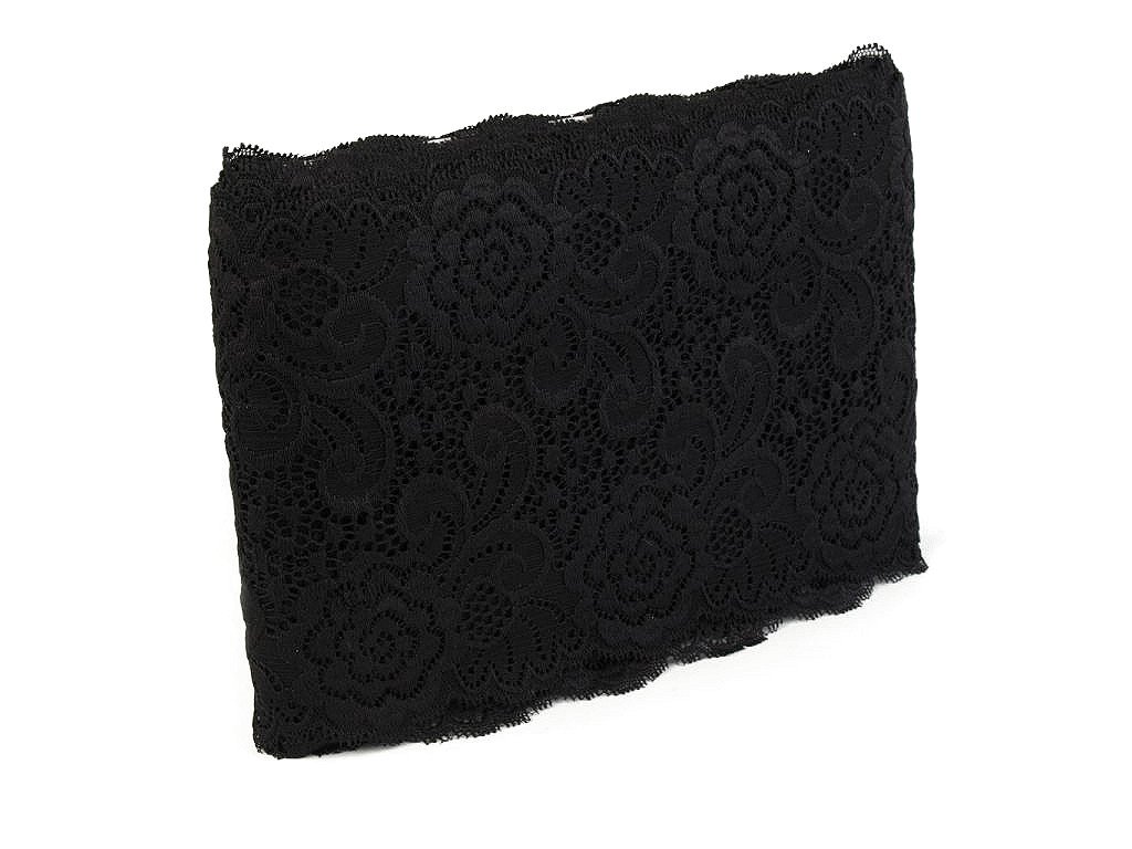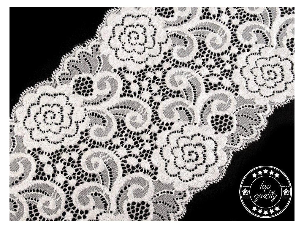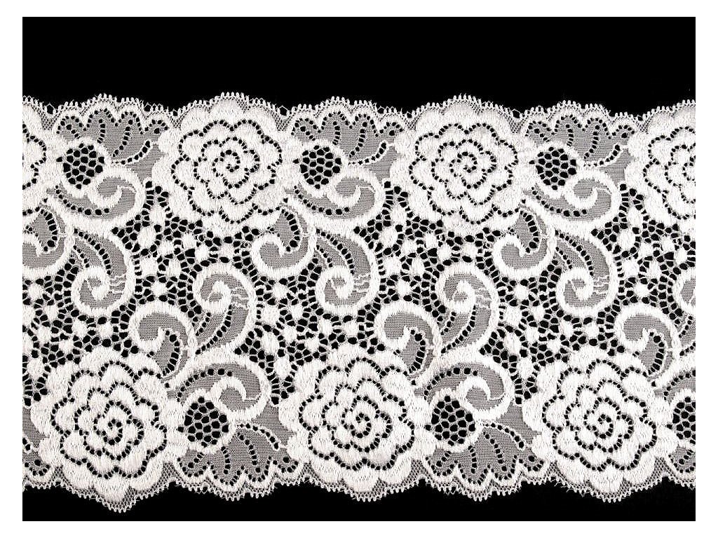 Elegantní krajka je pružná. Zdobí ji jemné květinové motivy.