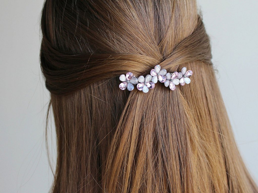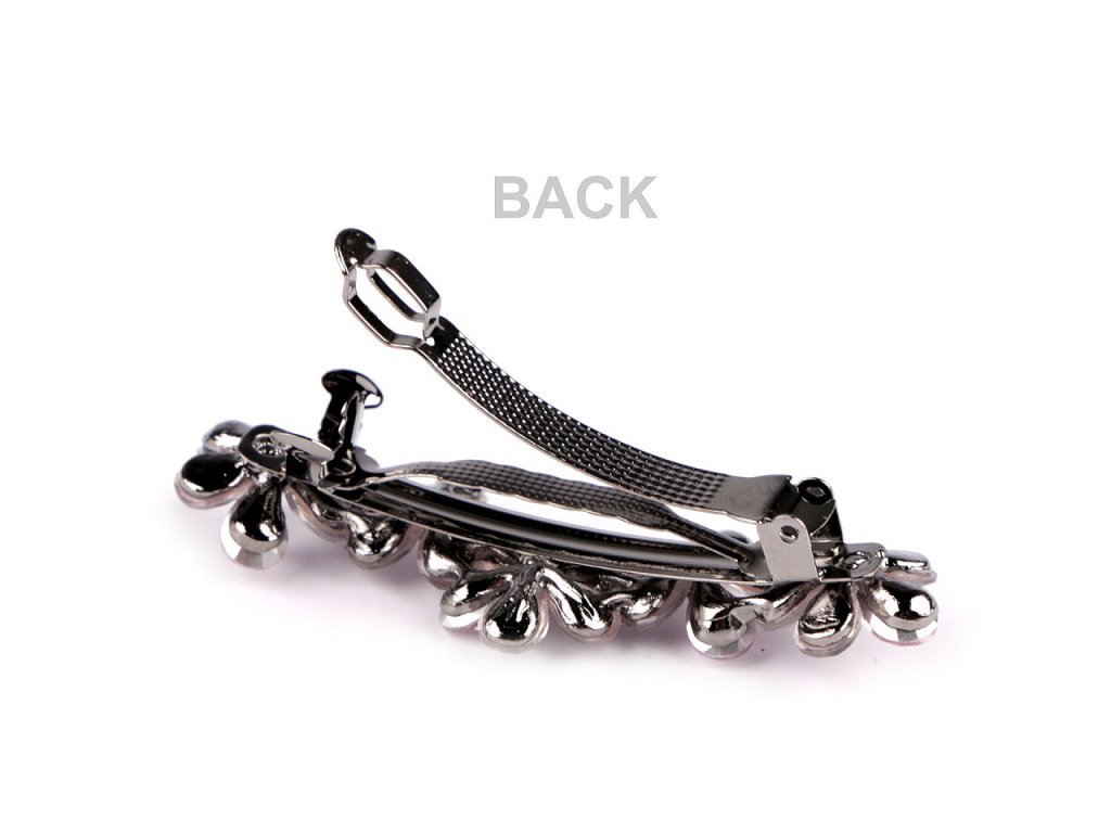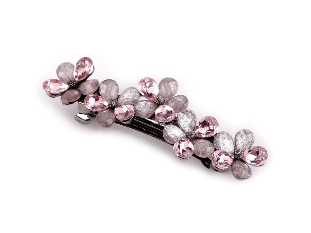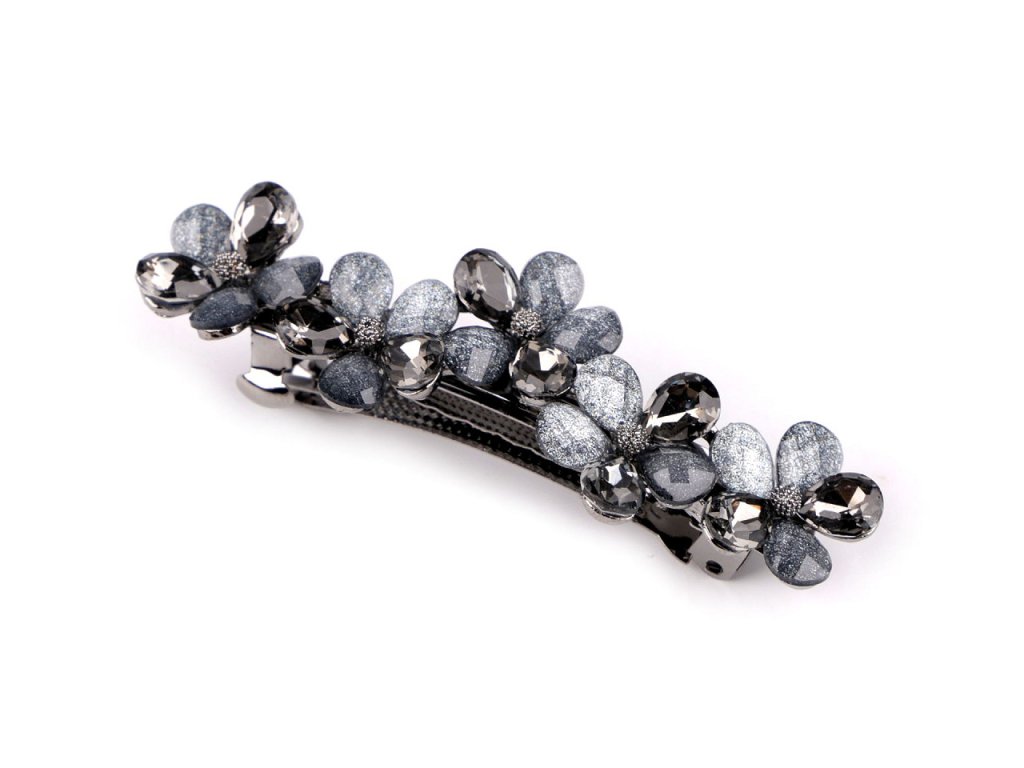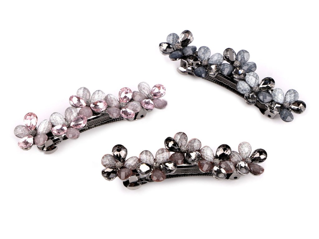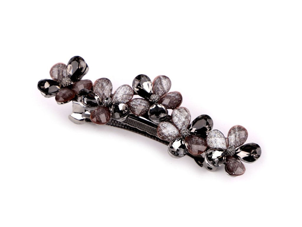 Francouzská spona zdobená akrylátovými broušenými květy luxusně ozdobí váš účes. Má nádherný lesk, který přitahuje pozornost. Luxusně ozdobí slavnostní účes. Ať už máte jemné prameny nebo husté lokny, touto sponou snadno sepnete vlasy do copu nebo vytvoříte elegantní drdol, který bude vypadat, jako kdyby ho vytvořil profesionál. Spona má velmi kvalitní celokovové provedení. Zacvakávací mechanismus je pevný.