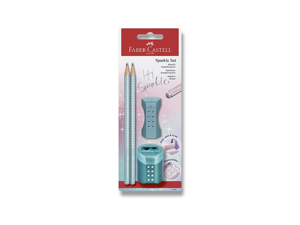Set dvou kvalitních grafitových tužek Faber-Castell Sparkle, ořezávátka Faber-Castell Sleeve Mini a pryže Faber-Castell Sleeve Mini. V atraktivní barvě Cosmic Ocean.