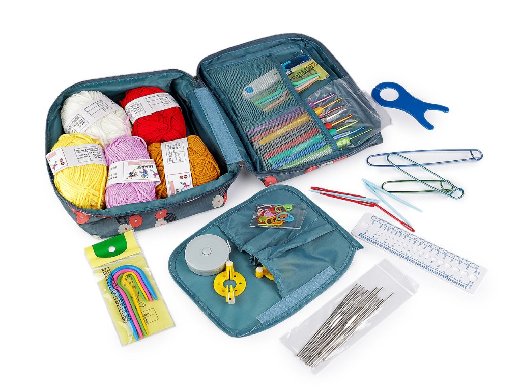 Sada háčků a pomůcek na háčkování je uložená v textilním pouzdře, které můžete snadno uzavřít pomocí zipu. Praktické pouzdro umožňuje snadnou organizaci a přenášení, ať už pracujete doma nebo na cestách.