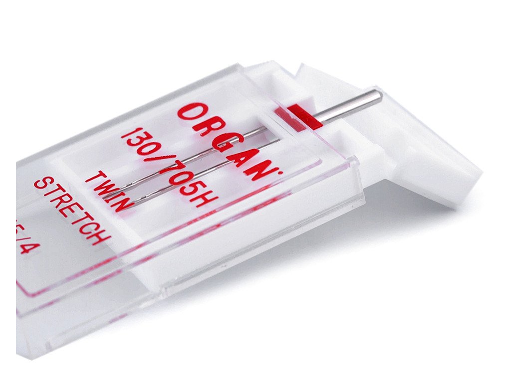 Dvojjehla Stretch Organ je vhodná na elastické materiály, jako jsou stretch a lycra. Rozteč jehly je 4 mm. Jehly mají z jedné strany plošku.