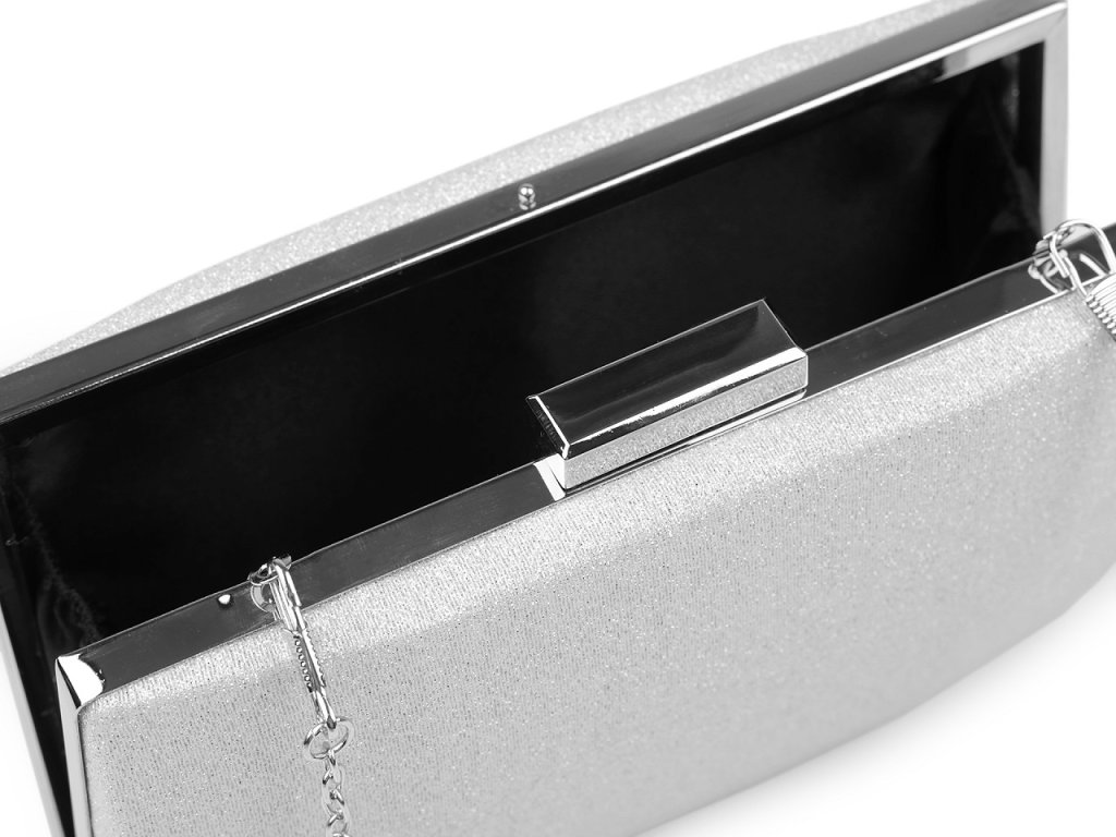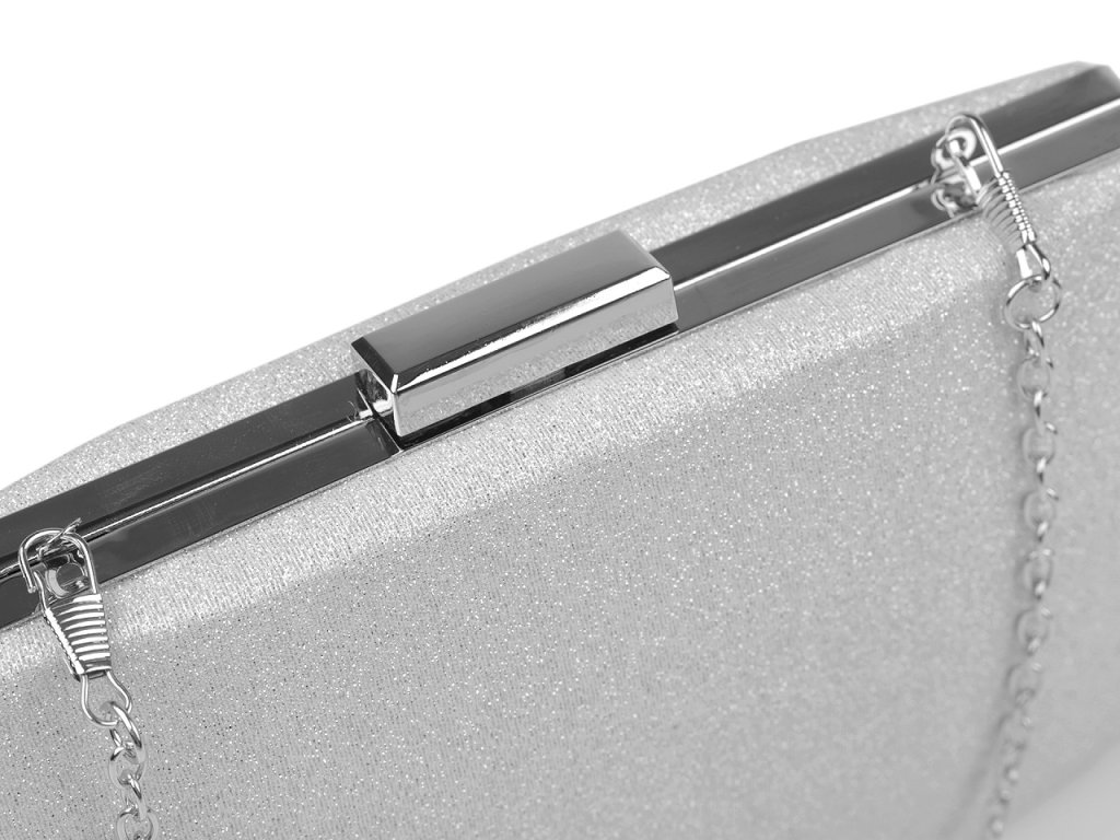 Malá společenská kabelka působí luxusně. Její jemně strukturovaný povrch se jemně třpytí. Zdobí ji výrazné lesklé zapínání a rámeček po celém obvodu v barvě kabelky. Kabelka je pevně vyztužená, její součástí je dlouhý odnímatelný řetízek na karabiny. Můžete ji nosit v ruce nebo jako crossbody přes rameno či do kříže.