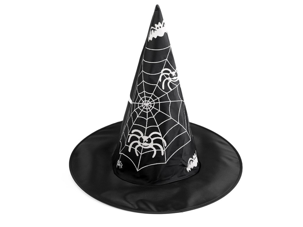 Karnevalový klobouk čarodějnický - pavučina, lebka, netopýr, dýně, čarodějnice