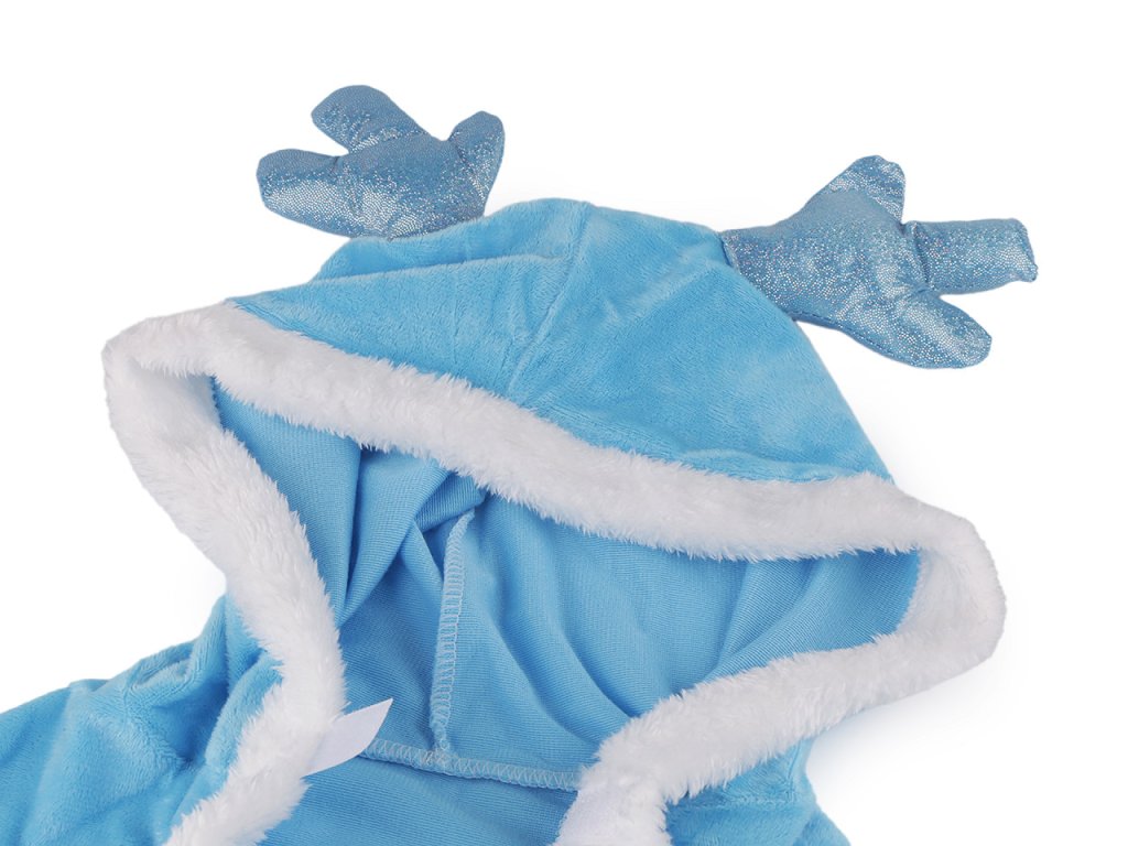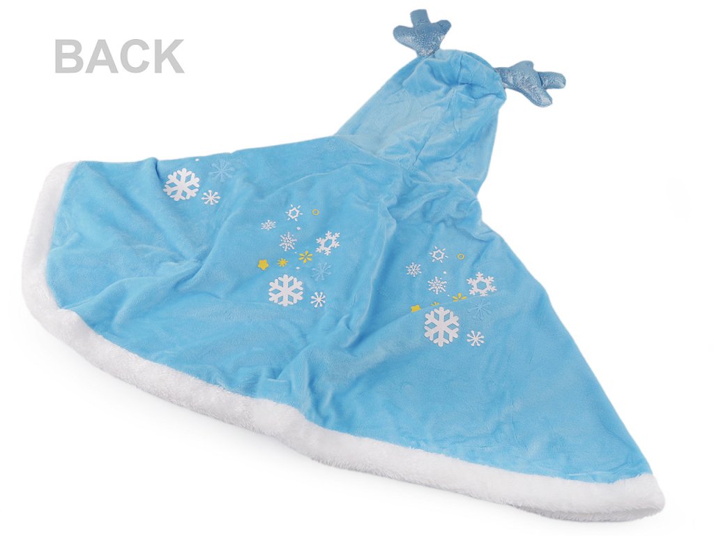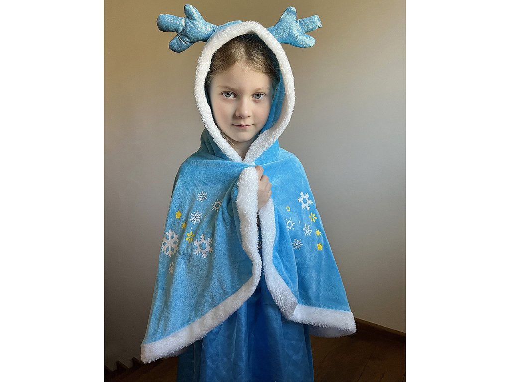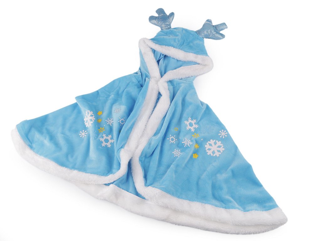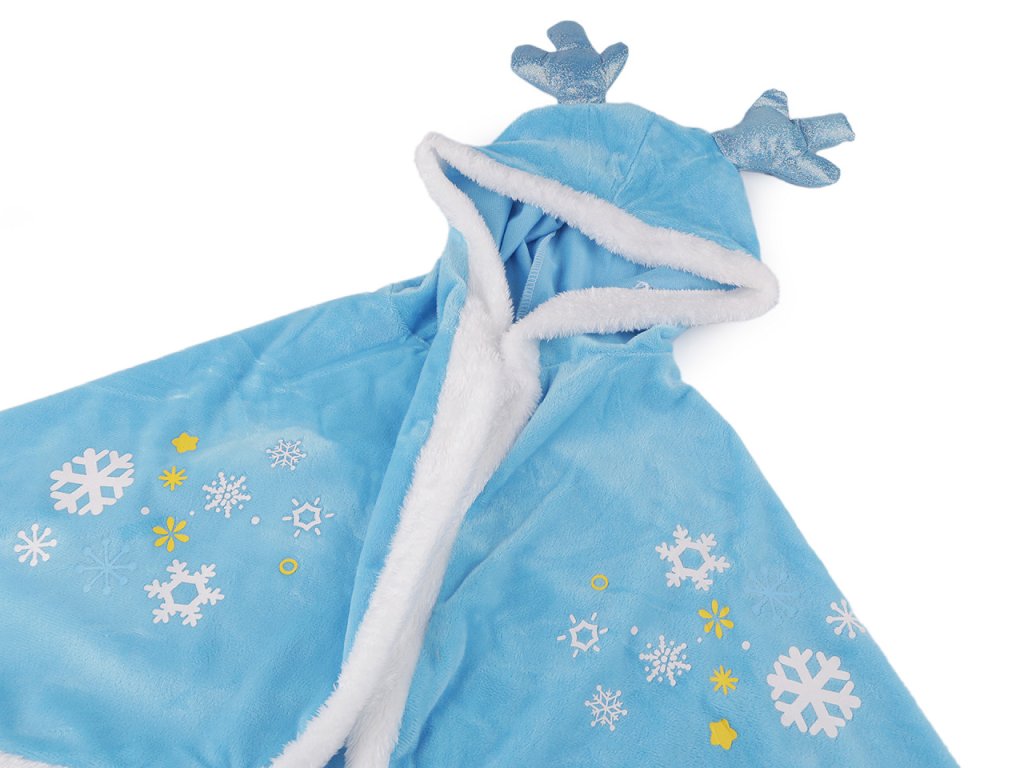 Karnevalový plášť pro malou ledovou královnu je měkký a velmi příjemný na dotek. Lemuje ho plyšová kožešinka, na kapuci jsou našité třpytivé rohy a pozoruhodným detailem je potisk sněhových vloček. Plášť se zapíná pomocí suchého zipu.