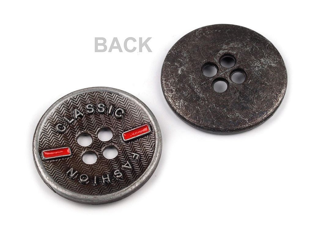 Knoflíky jsou vyrobené z nemagnetického kovu. Zdobí je nápisy "classic" a "fashion". Jsou čtyřdírkové. Knoflíky můžete našít na košile, mikiny, bundy apod.