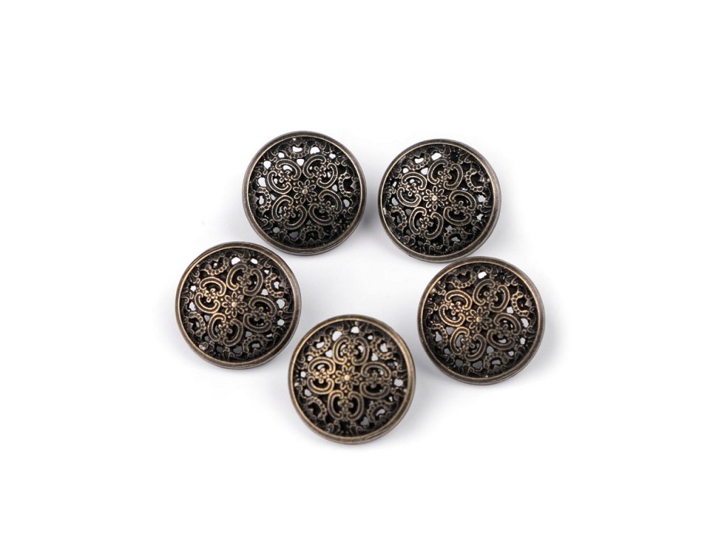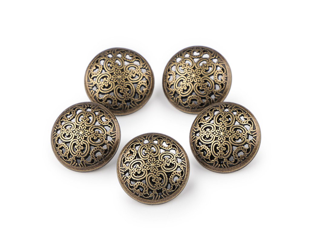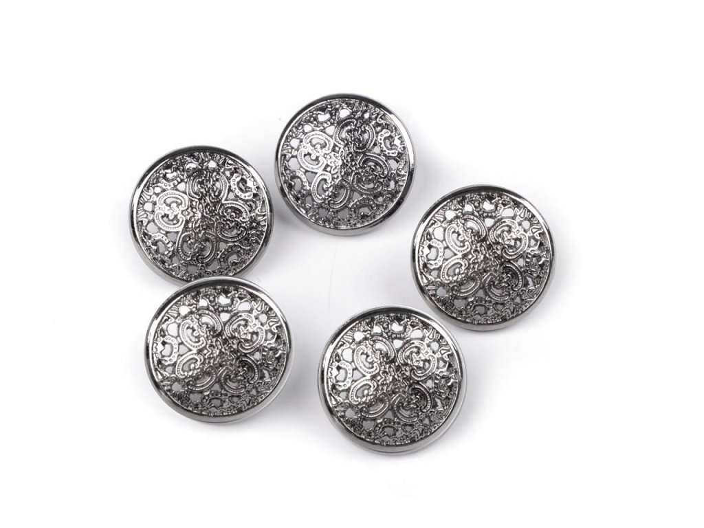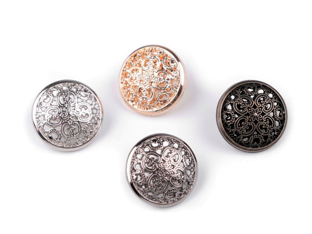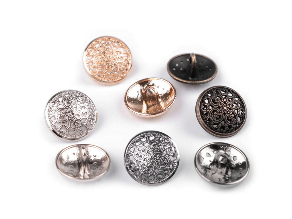 Kovové knoflíky zdobí filigránový vzor. Jsou vyrobené ze slitiny zinku a nemagnetických kovů. Mají spodní přišívání. Knoflíky podtrhnou eleganci kabátů, sak, košil apod. Vyniknou také na doplňcích jako jsou kabelky, tašky nebo klobouky.
