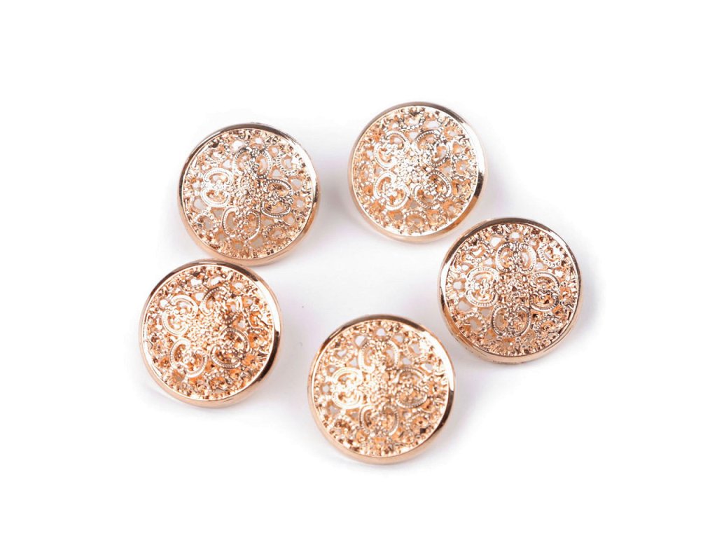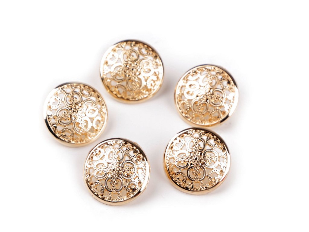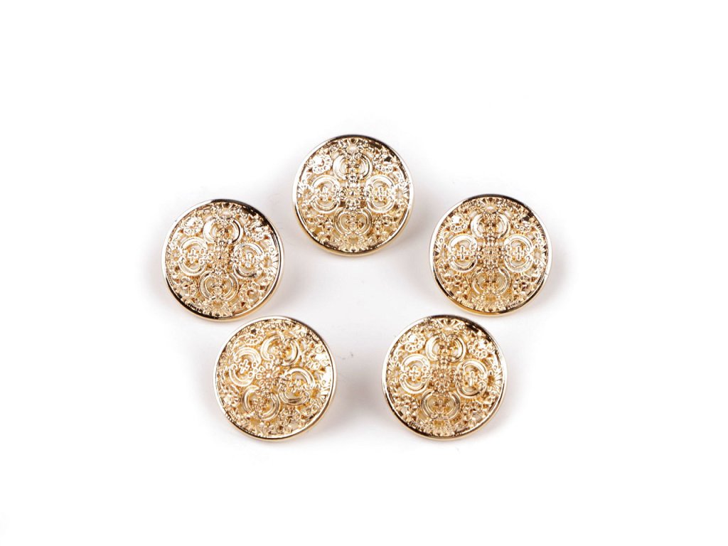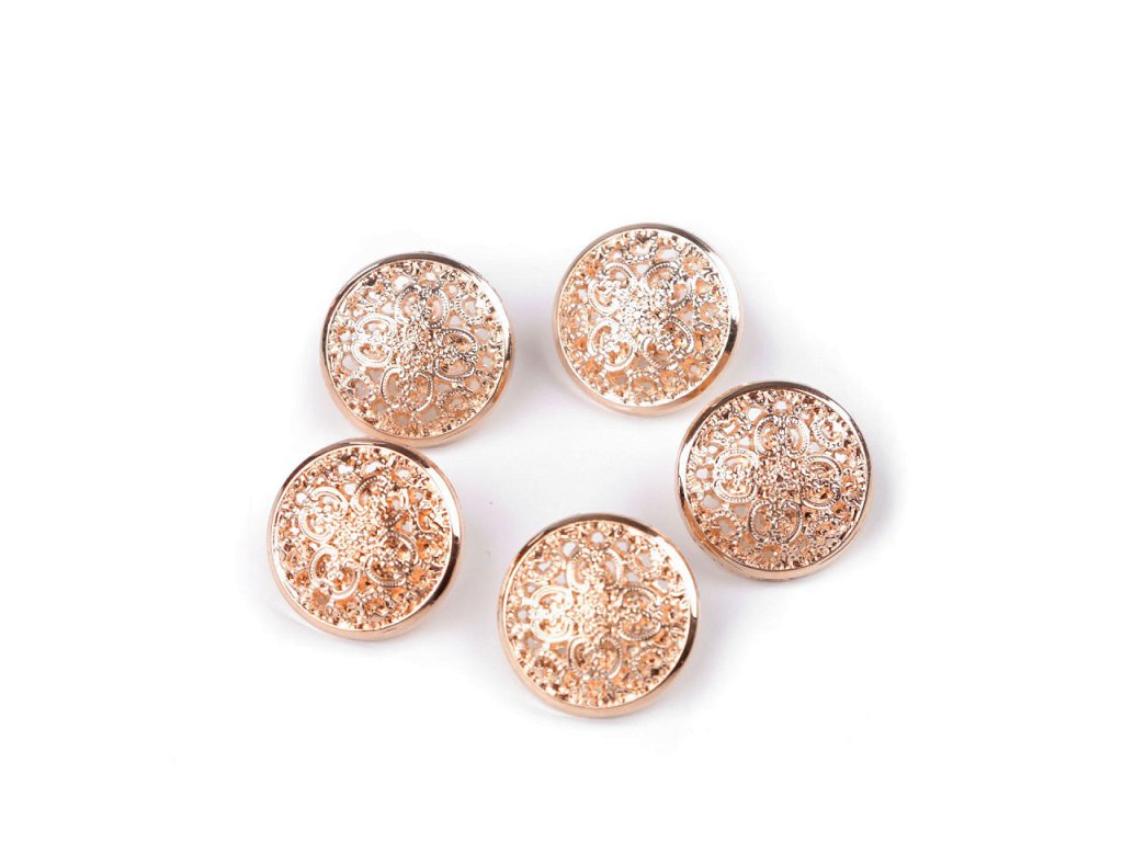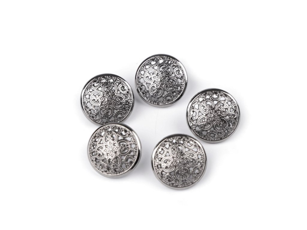 Kovové knoflíky zdobí filigránový vzor. Jsou vyrobené ze slitiny zinku a nemagnetických kovů. Mají spodní přišívání. Knoflíky podtrhnou eleganci kabátů, sak, košil apod. Vyniknou také na doplňcích jako jsou kabelky, tašky nebo klobouky.