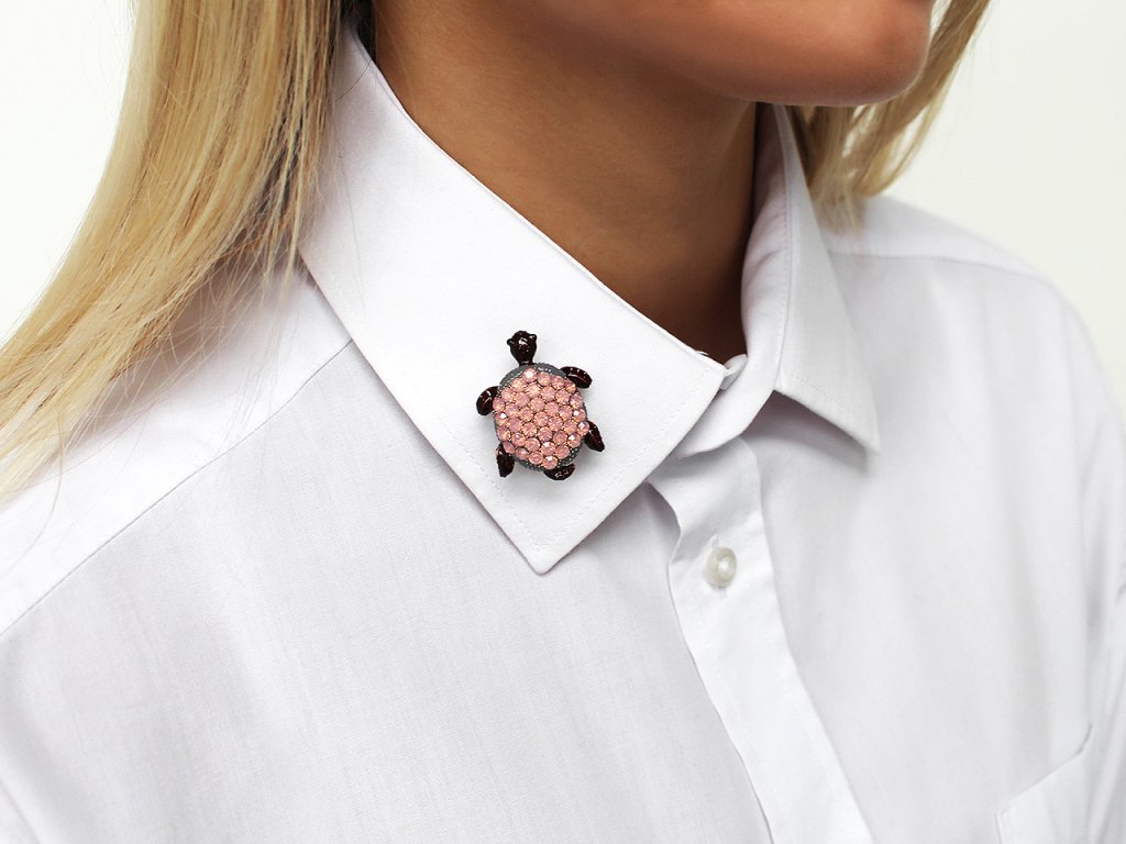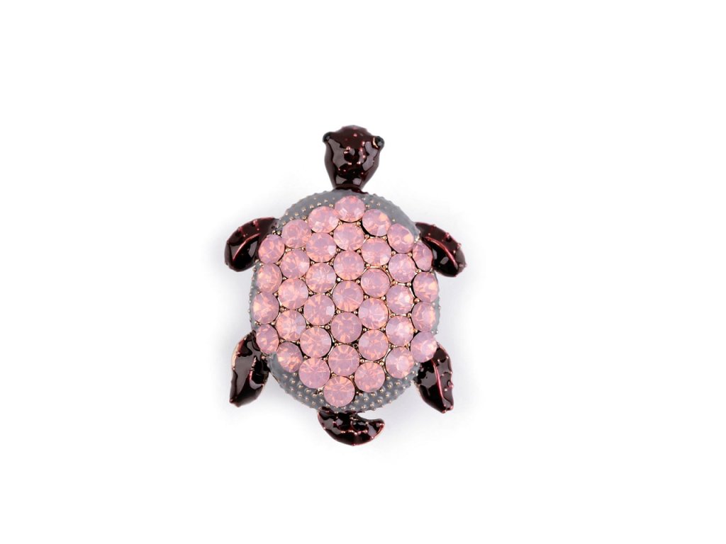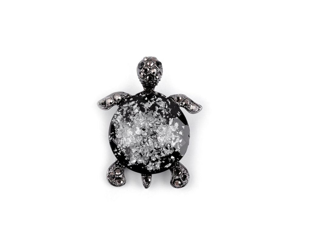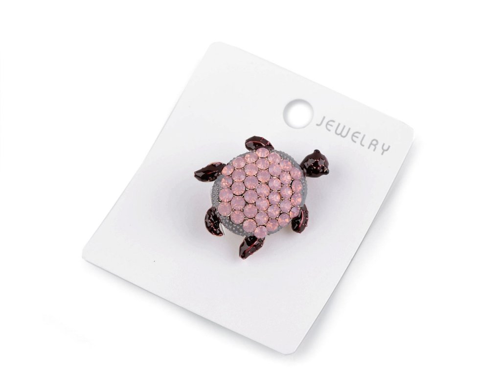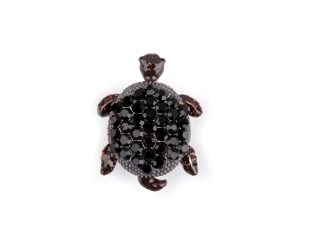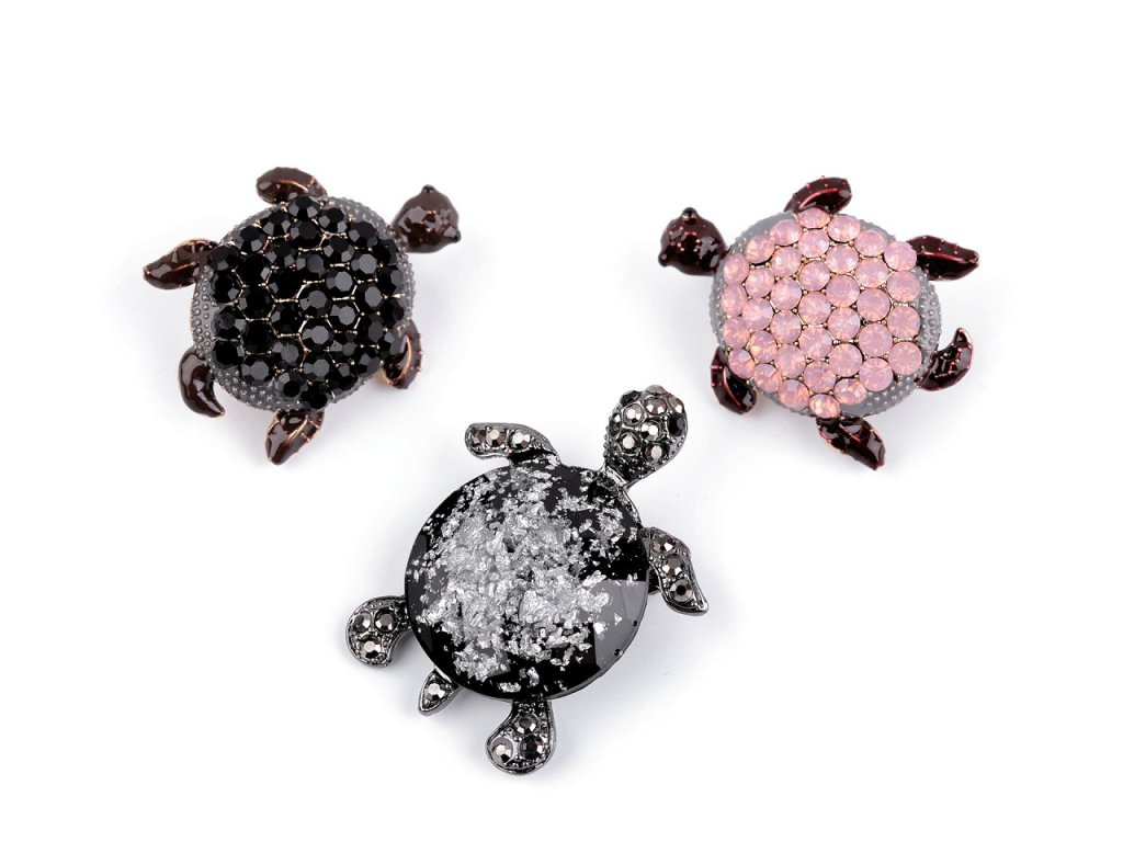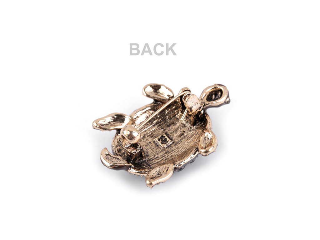 Brož s broušenými kamínky ve tvaru želvy je nádherný doplněk, který zaujme svým třpytivým vzhledem a pečlivým zpracováním. Brož je kvalitní, celokovová. Ze zadní strany má brožový špendlík.