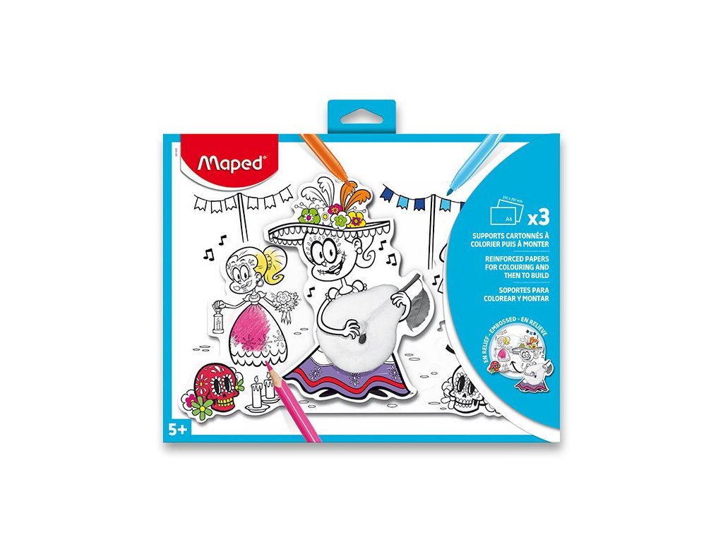 Omalovánky Maped s 3D elementy. Součástí je bloček s lepicími polštářky, díky kterým samostatné elementy připevníte k předloze a díky tomu získáte zajímavý 3D efekt. Obrázek ožije a stane se zajímavou dekorací dětského pokoje. Vhodný pro vybarvování běžnými pastelkami či fixami. Dostupné ve dvou variantách, 3 rozdílné ilustrace. Formát A4. Papír 350 g/m2.