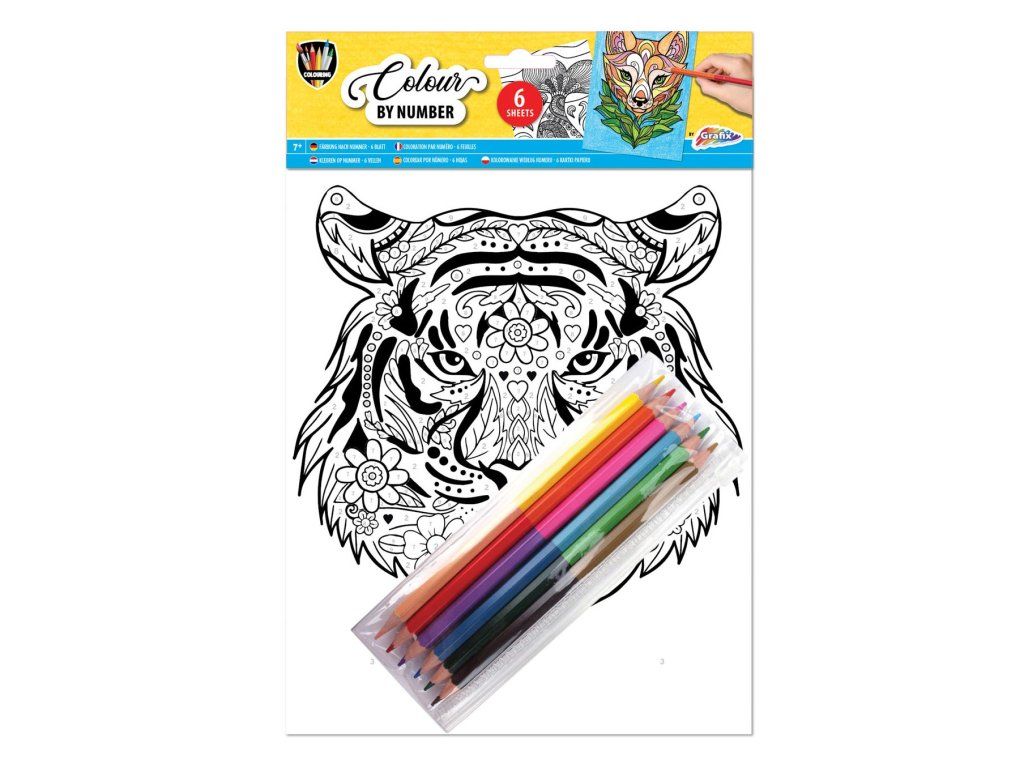 Obsahuje: 6 různých obrázků, 6 oboustranných pastelek s čísly (hnědá, zelená, vínová, oranžová, žlutá, růžová, červená, fialová, modrá, zelená, černá).