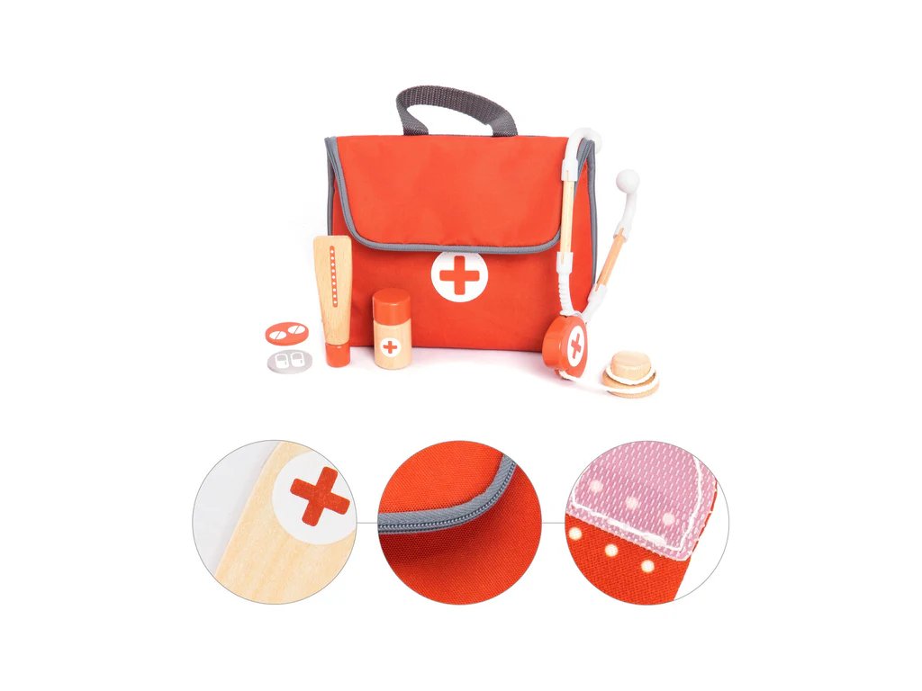 Tento dřevěný lékařský set je ideální pro ilustraci zdravotních úkonů, oblíbenou “hru na doktora”, ošetřování zraněných kolínek a léčbě nemocných plyšáků. Nabízí také nekonečné množství prostoru pro další volnou hru. Jednoduše tak, jak to jen hračky, které rostou spolu s dětmi, umí.