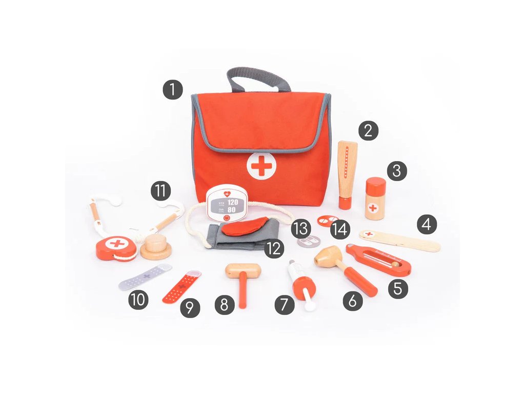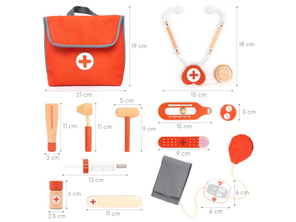 V této pečlivě navržené čtrnáctidílné sadě najde váš malý zdravotník vše potřebné k léčbě nejrůznějších neduhů. Teploměr, tlakoměr, stetoskop, náplasti, léky, masti… vše připravené tak, aby si dokázal hravě poradit s jakoukoli zdravotní výzvou.