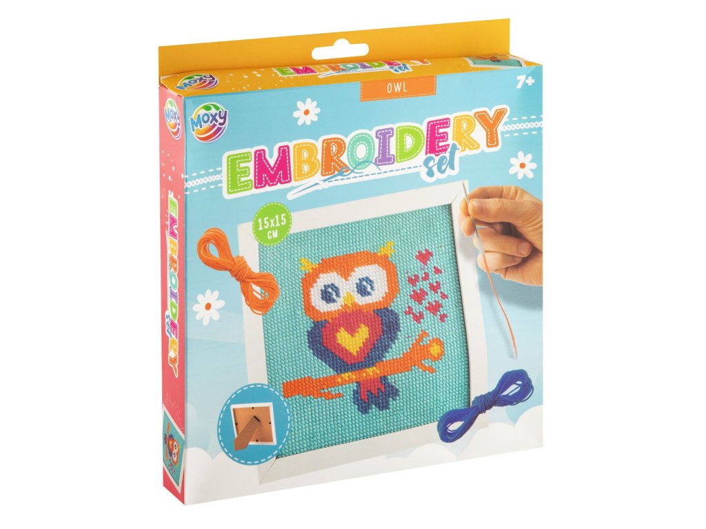 6 bavlnek, vyšívací kovovou jehlu s kulatým hrotem, bílý plastový rámeček se stojánkem 15 x 15 cm. Na zadní straně obaluje je obrázkový návod jak na vyšívání.