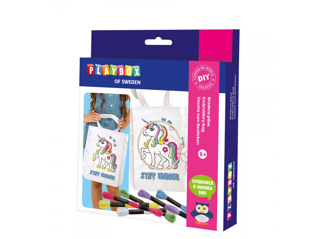 Obsahuje:Tašku s předlohou jednorožce (18 x 7 x 28,5 cm), 6 bavlnek, jehlu a bubínek. Vhodné od 6 let.