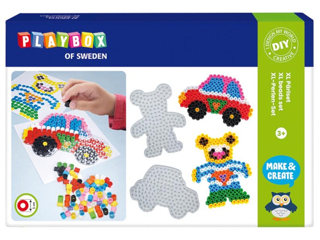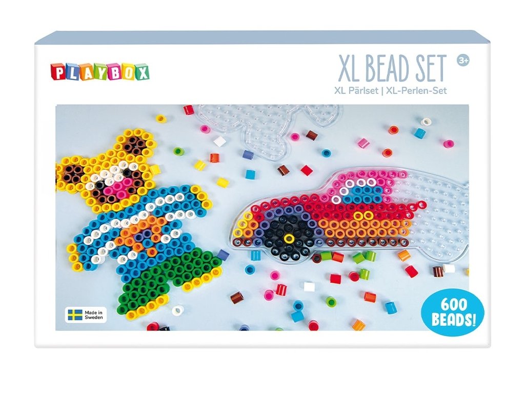 Balení obsahuje 600 ks XL zažehlovacích korálků různý barev o průměru 10 mm, 2x podložka - méďa a auto cca 18 x 14 cm, 2x předloha a pečící papír.
