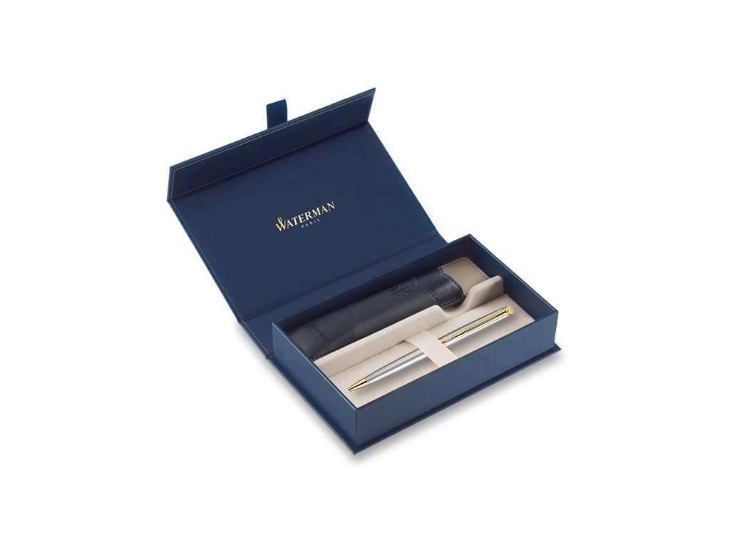 Sada obsahuje modré PU pouzdro a kuličkové pero Waterman Hémisphère Stainless Steel s tělem z broušené nerezové oceli. V kombinaci s doplňky pokovenými 23karátovým zlatem.