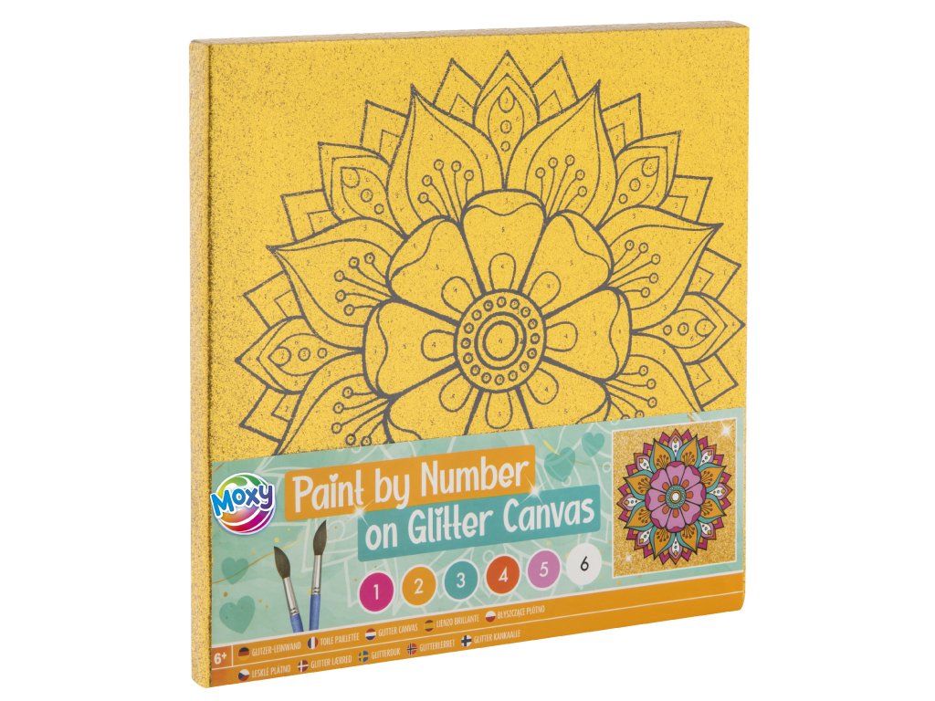 Balení obsahuje: předkreslené plátno - zlaté glitrové 25 x 25 cm, 6 akrylových barev, 2 štětce.