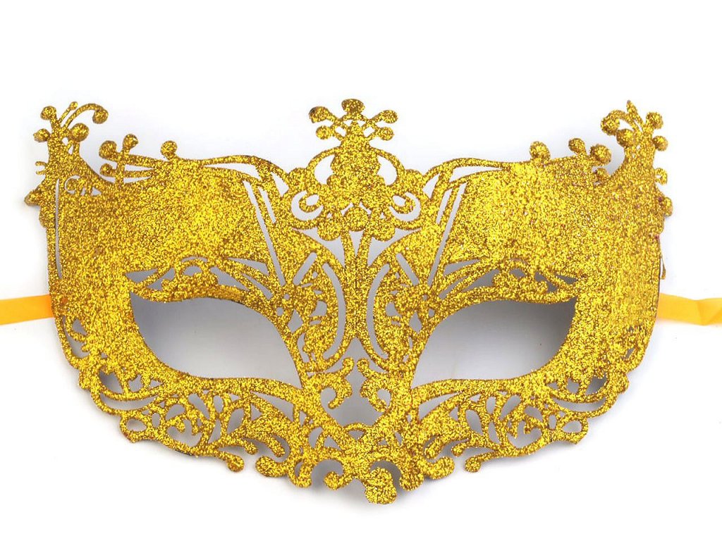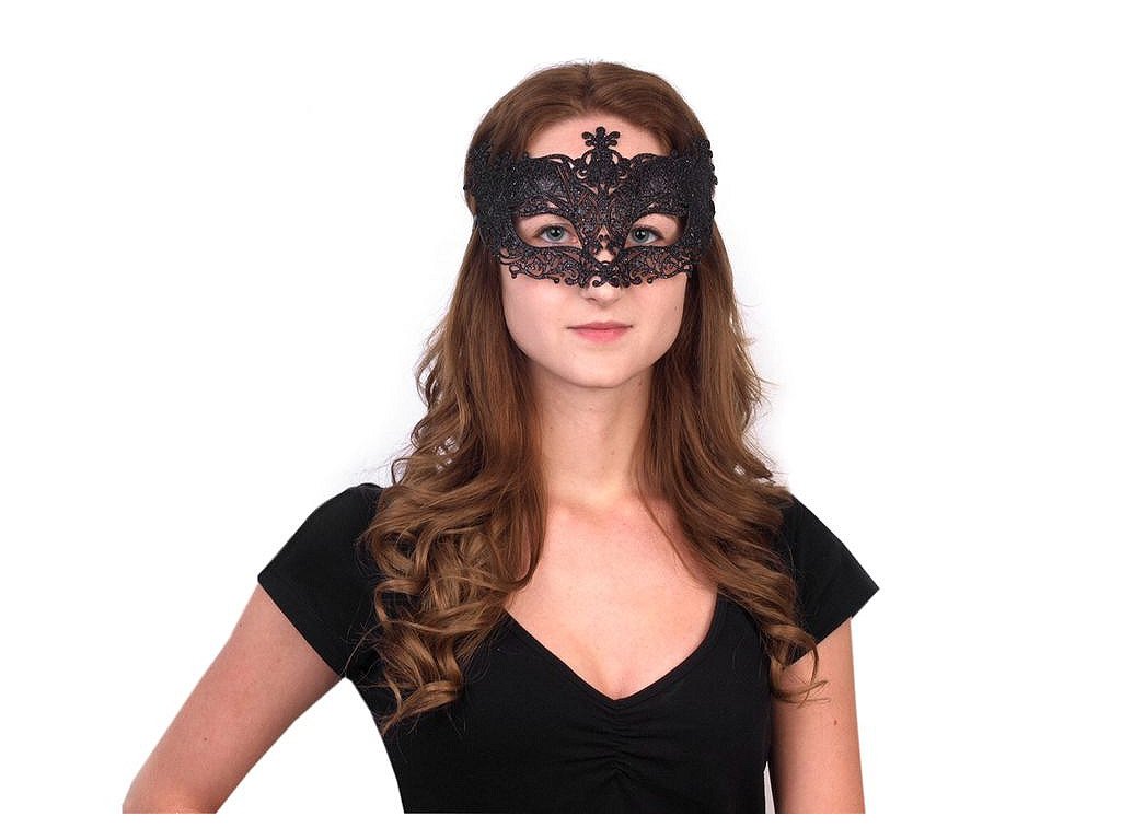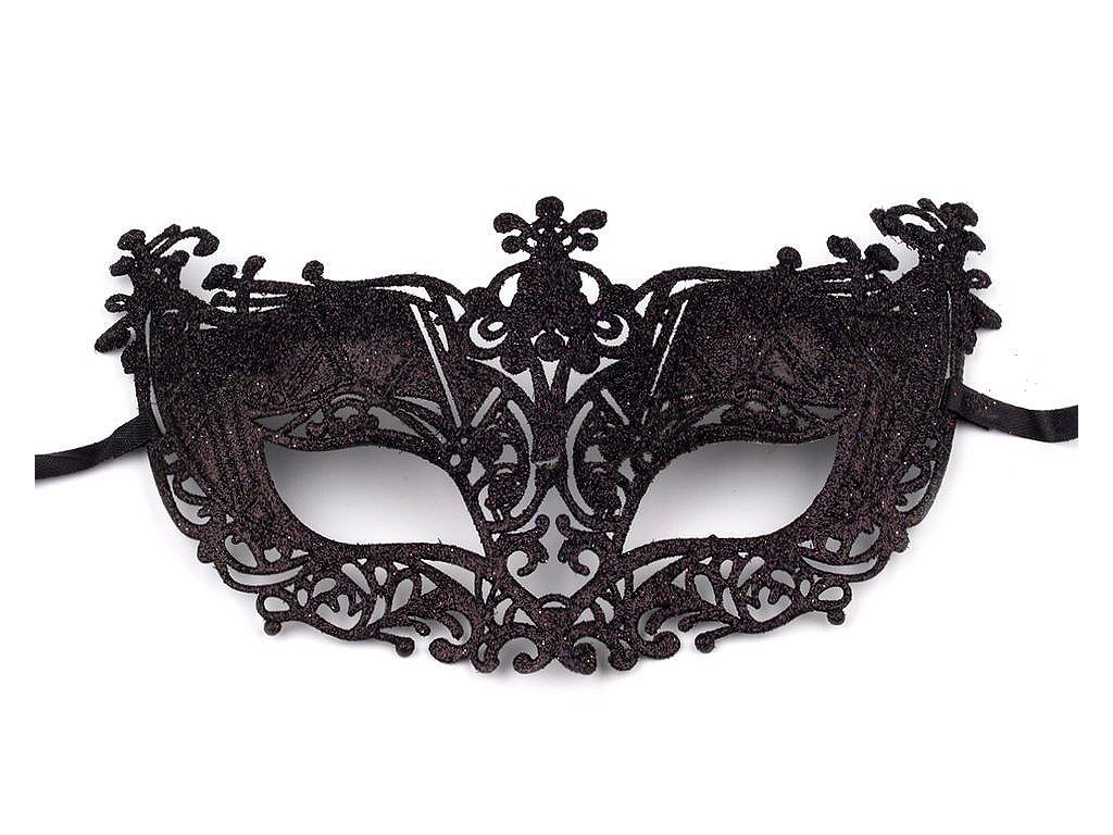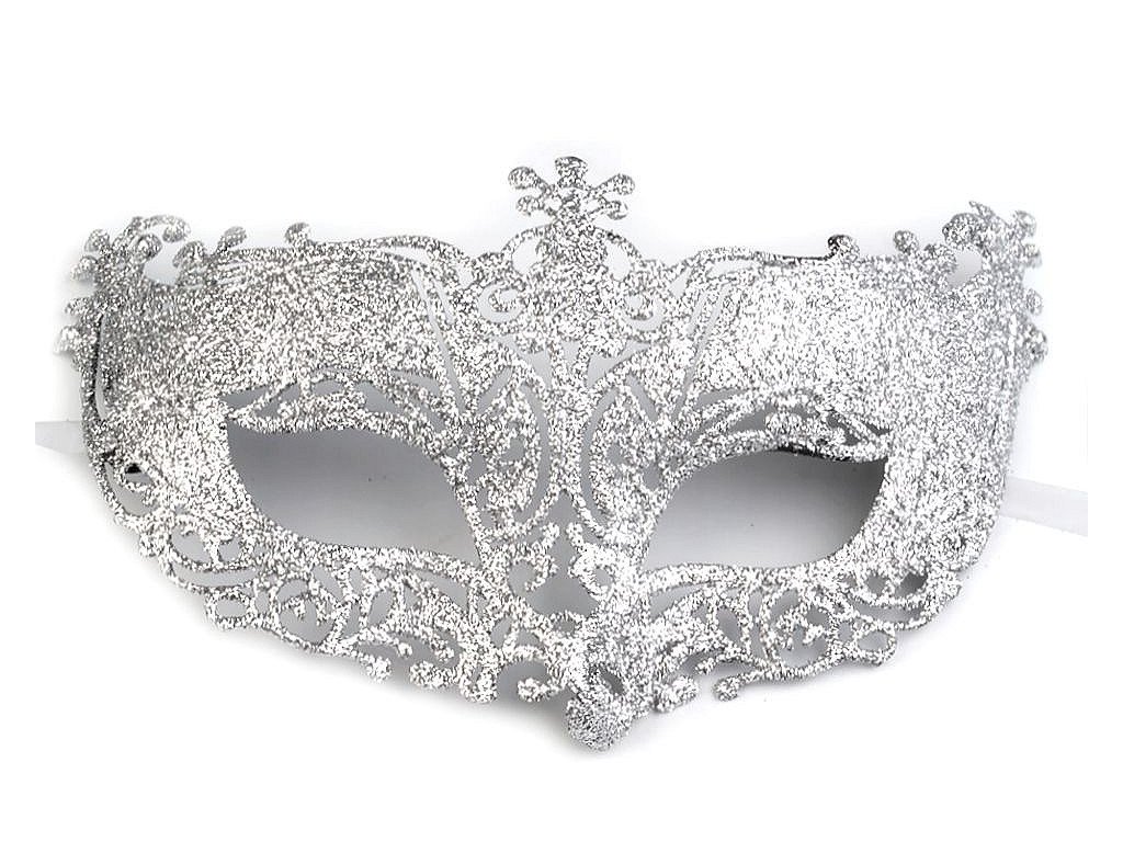 Úchvatná škraboška vypadá jako by byla z jemné krajky. Je však vyrobená z pevného plastu, který dobře drží tvar. Třpytivé glitry dodávají masce dramatičnost. Zazáříte s ní na karnevalech, večírcích nebo na párty. Maska se zavazuje pomocí saténové stuhy. Jelikož jsou glitry na škrabošce nalepené, mohou lehce opadávat.