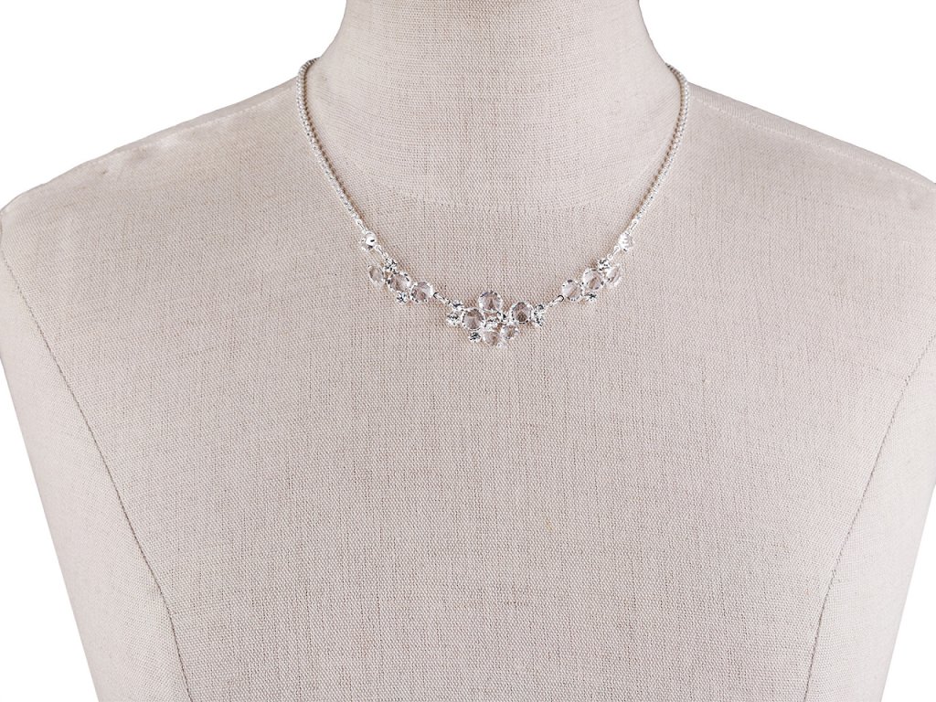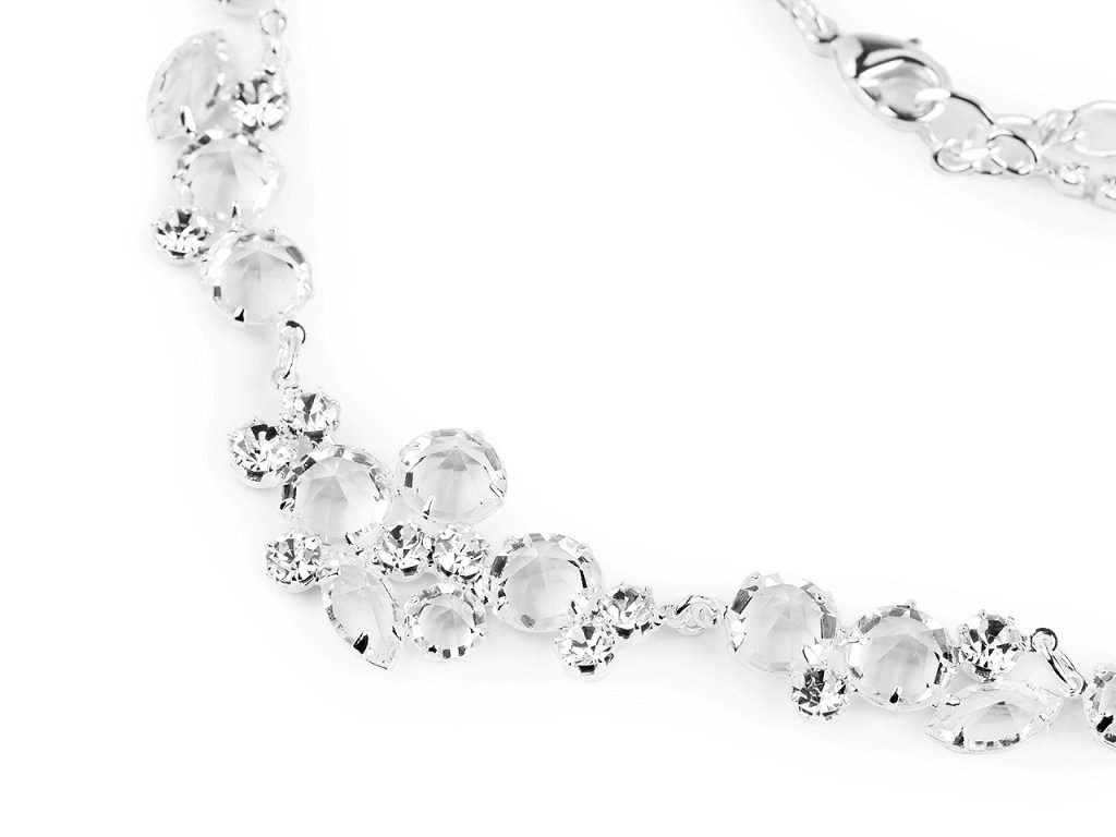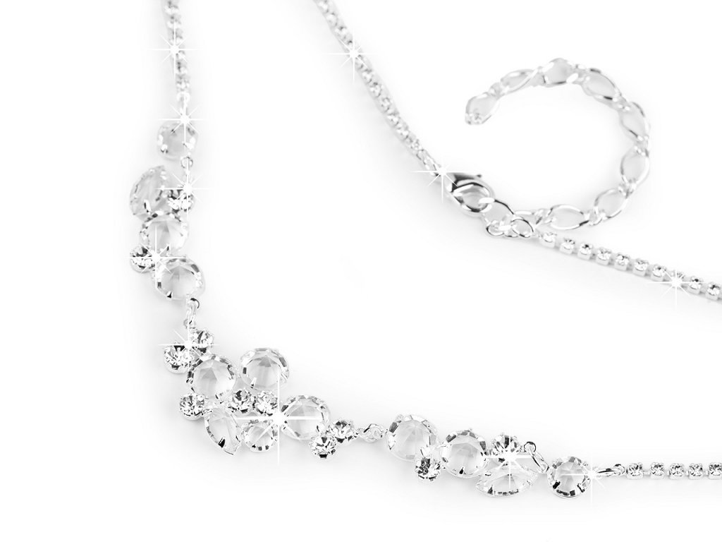 Elegantní štrasový náhrdelník je ozdobený broušenými kamínky. Každá žena jej ocení na speciální příležitosti, je nepřehlédnutelný. Skleněné broušené kamínky prvotřídní české kvality jsou pevně zasazené do kovových lůžek. Na slunci i umělém světle se náhrdelník zajímavě třpytí. Kov na náhrdelníku má povrchovou úpravu se stříbrnou galvanizací.